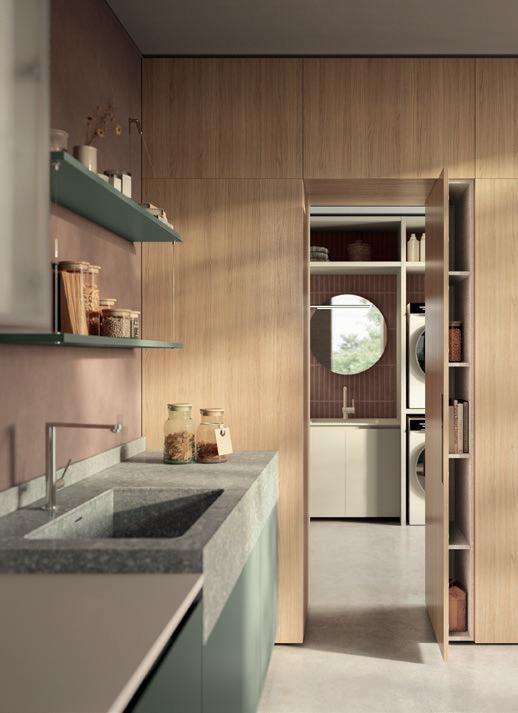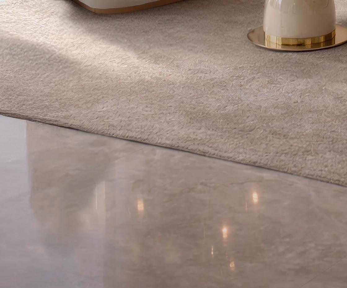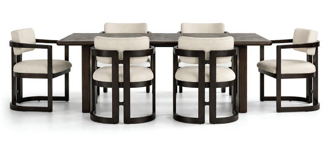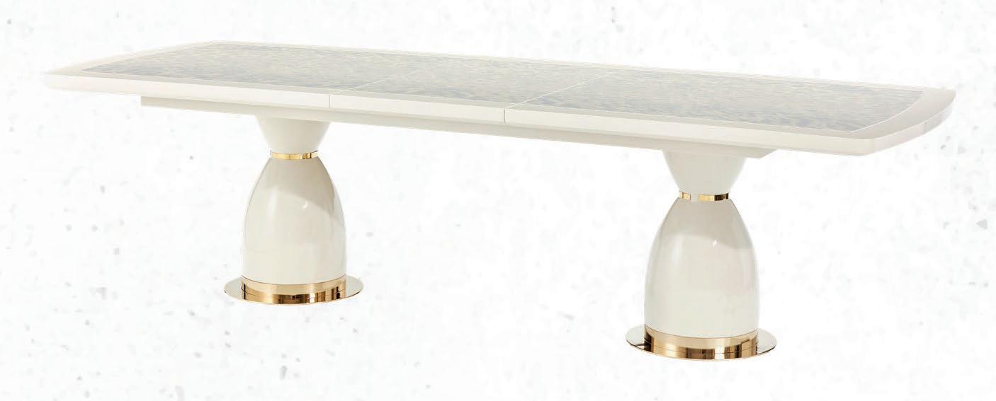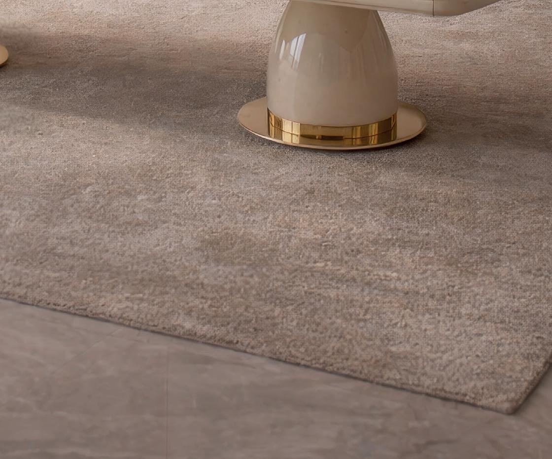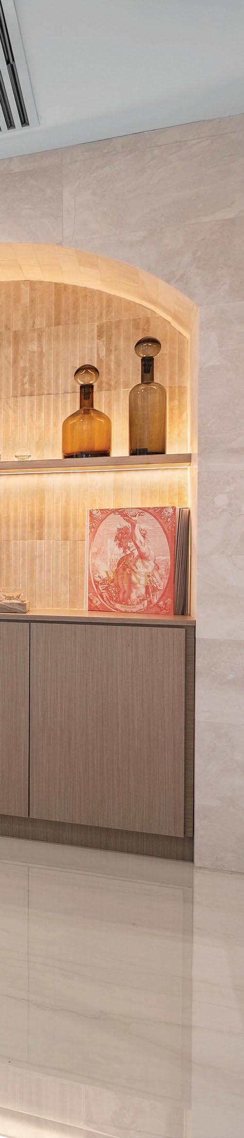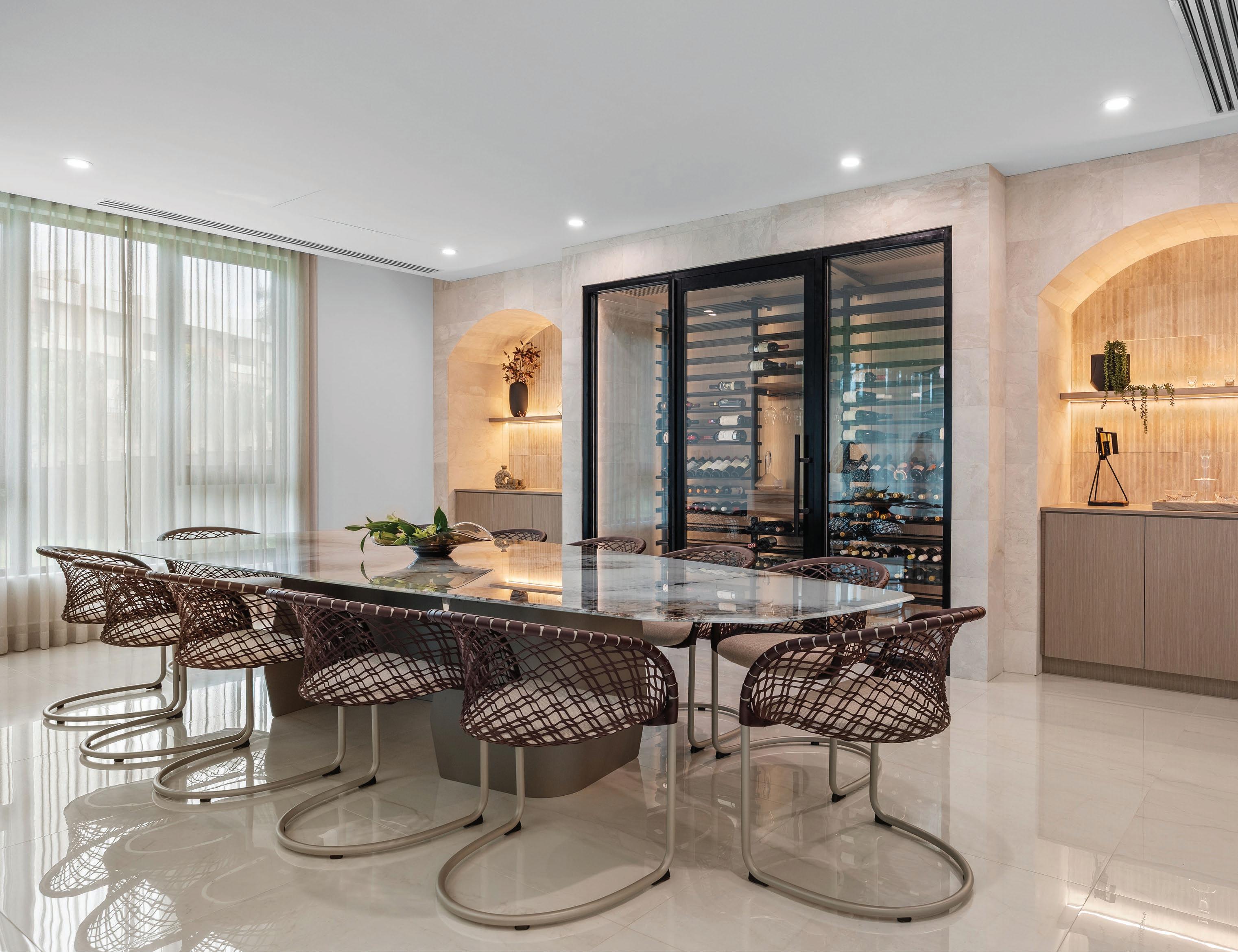 La cocina continúa la narrativa con topes en Taj Mahal, mientras el comedor formal incorpora uno de los deseos más particulares de los clientes: una cava integrada acompañada por muebles laterales tipo buffet revestidos en Diana Royal. La mesa para doce comensales, de Palacios, sorprende al simular piedra aunque está realizada en vidrio.