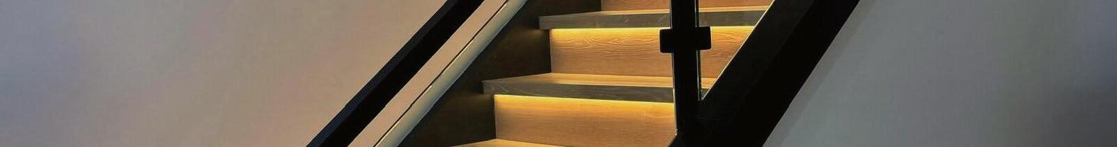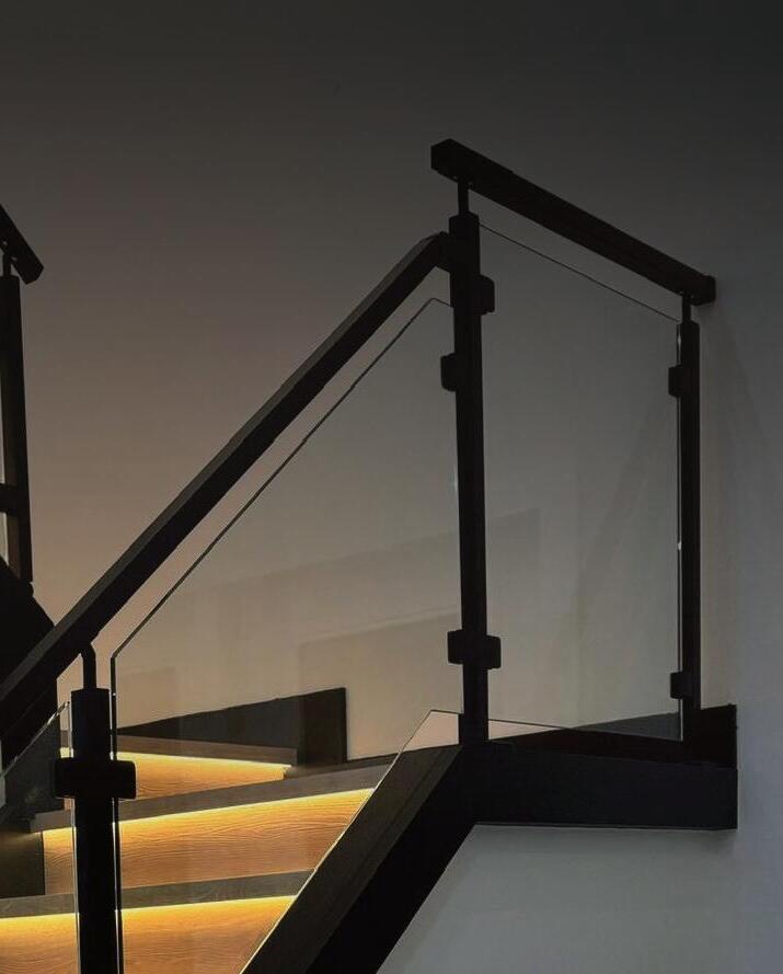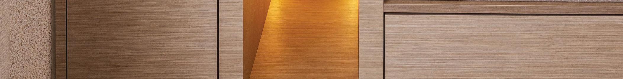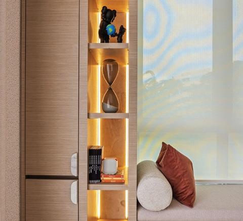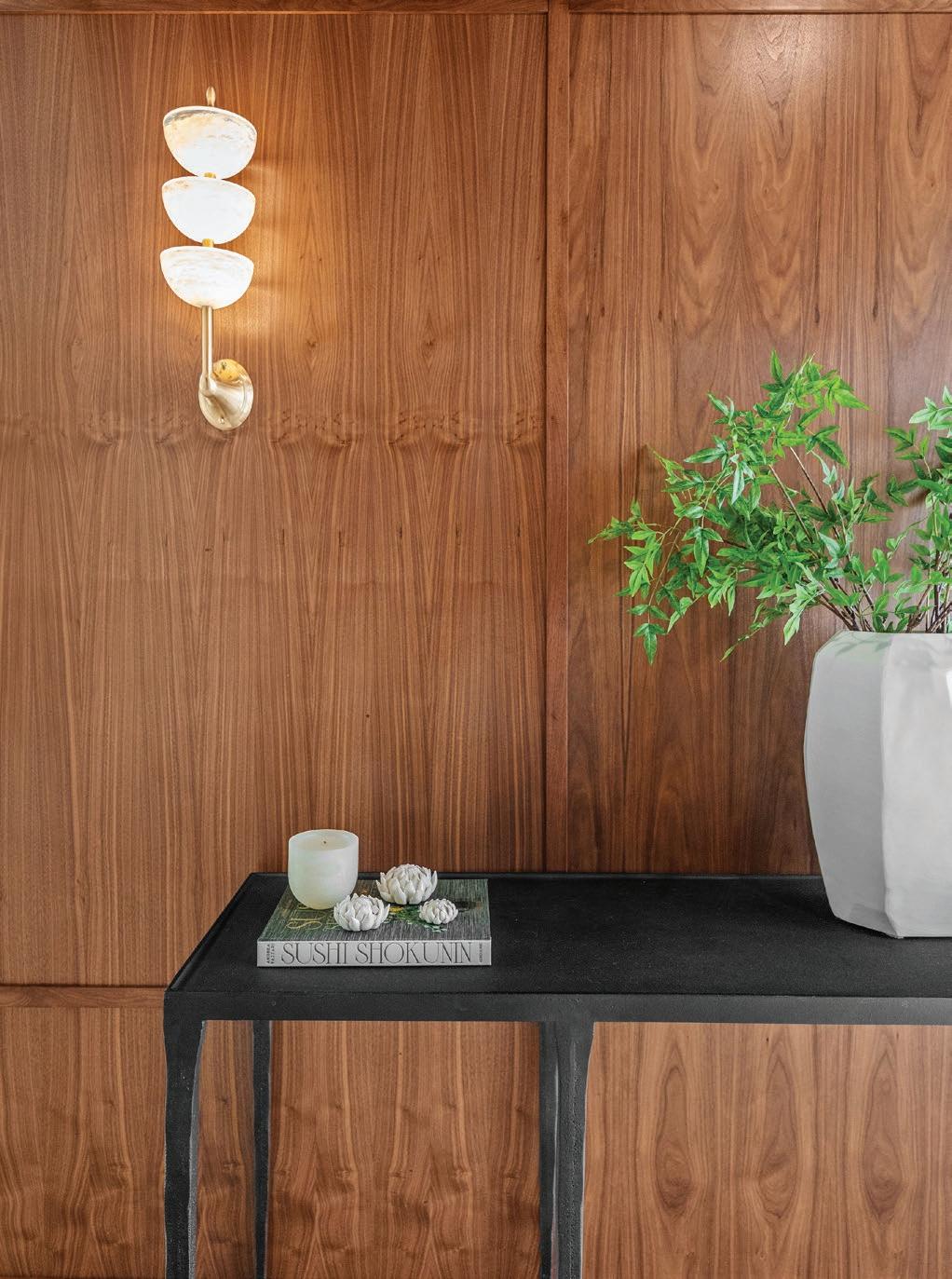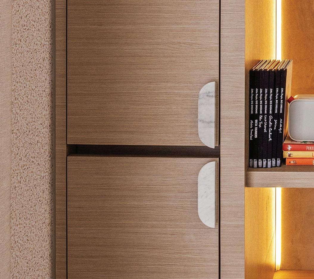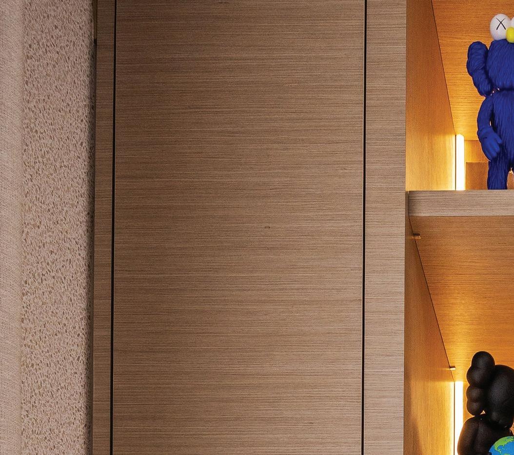 La entrada principal introduce un gesto elegante: los paneles continuos esconden discretamente la puerta hacia la escalera y el baño de visitas, mientras las luminarias integradas crean profundidad y sofisticación.