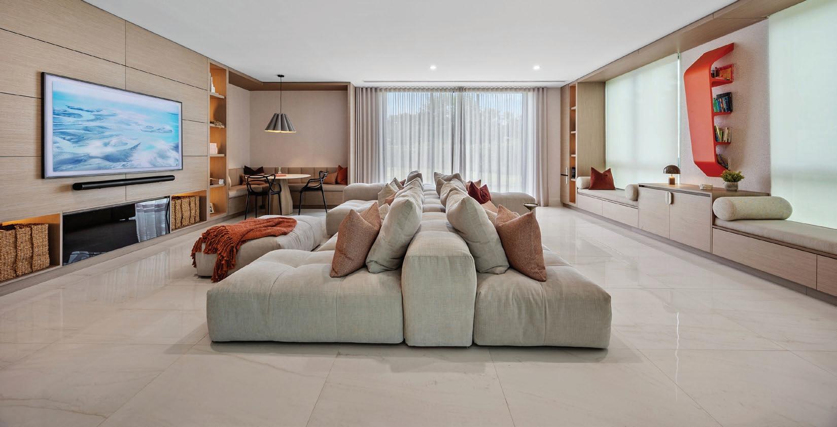 En el family room, gran parte del mobiliario fue diseñado a medida por Daubón Interiors, creando un espacio íntimo y coherente con la dinámica familiar.