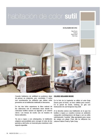 COLORES BENJAMIN MOORE En la foto de la izquierda se utilizó el color Baja Dunes para el techo, un tono cálidos pero sereno. En la pared de fondo, Iceberg, un gris con insinuación de azul turquesa muy sutil. A la derecha vemos una habitación en la que los textiles a rayas y a cuadros recrean un ambiente campestre contemporáneo sin llegar a ser un estilo estrictamente “country”. Muy apropiado para casas de campo y/o playa. Para ella se utilizaron los colores Palace Pearl y Tyler Gray.