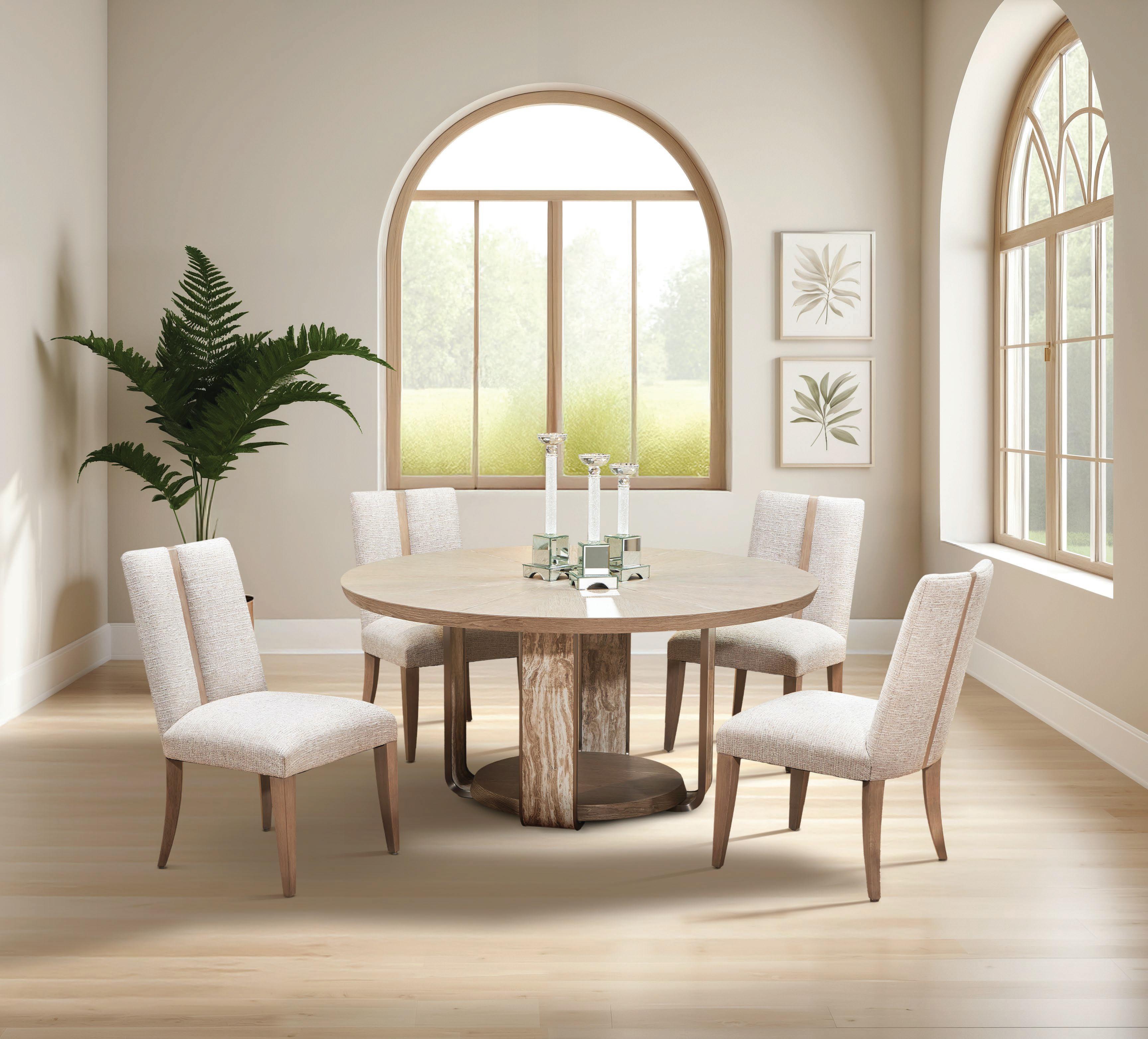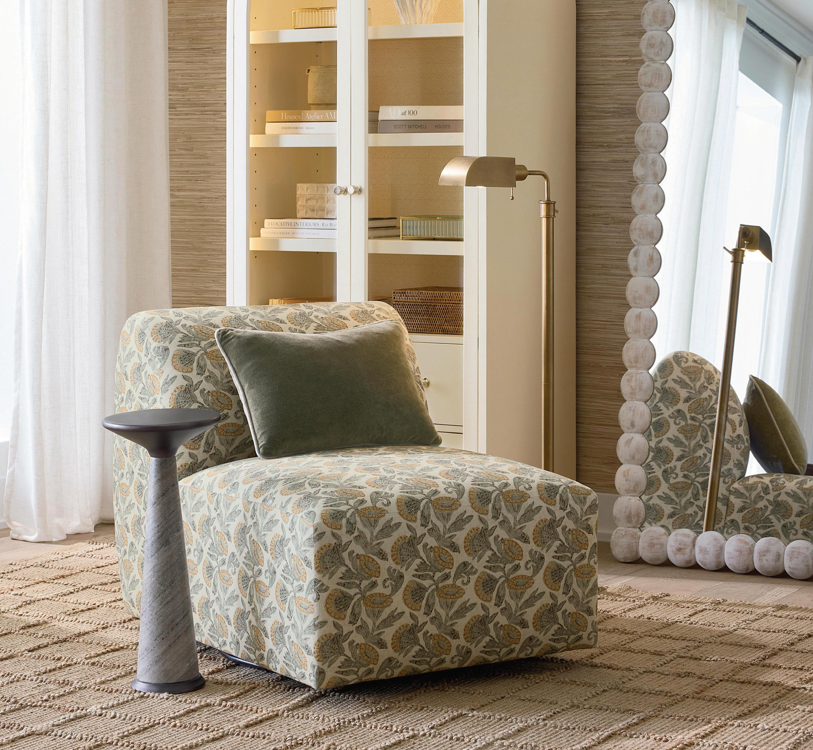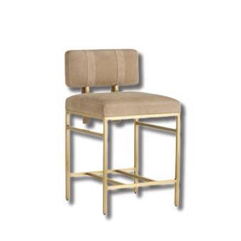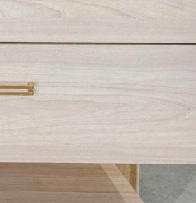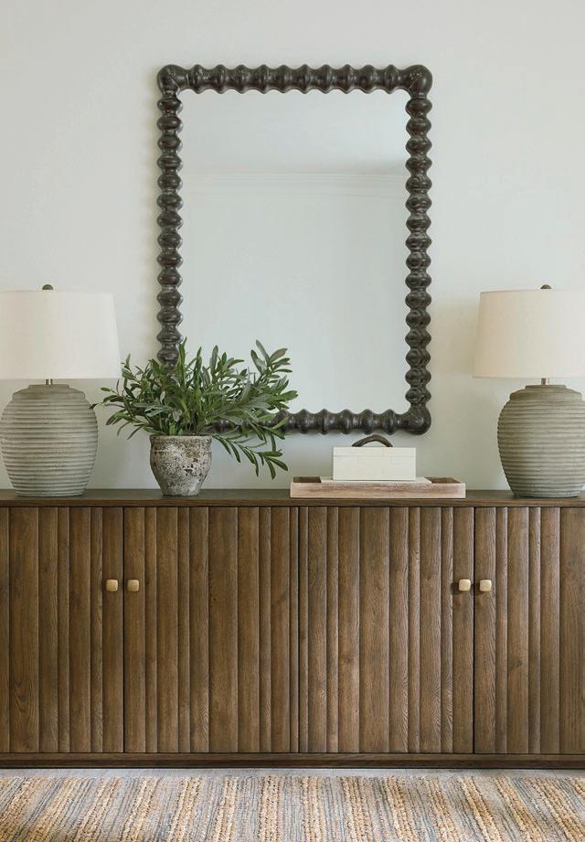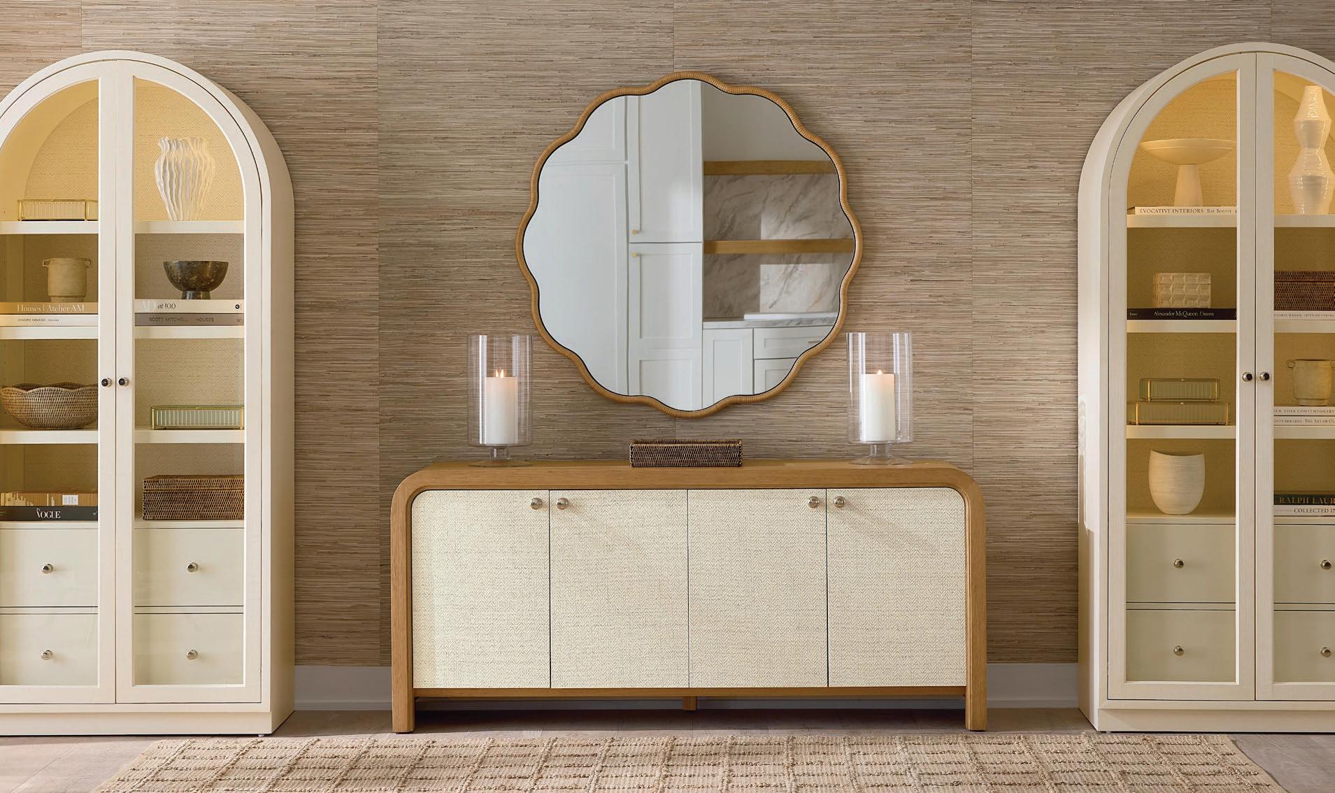 Para completar el espacio, opté por piezas excepcionales de Arteriors. La Montevito Credenza, con patrones geométricos inspirados en el Art Déco, presenta una terminación en cuero marfil y tiradores en semicírculo que aportan un detalle distintivo Acompañándola, el Laney Stool, completamente funcional, en tono taupe y con acabado en antique brass, añade equilibrio y versatilidad al conjunto