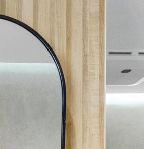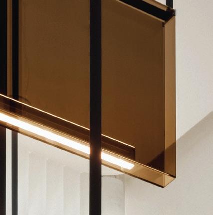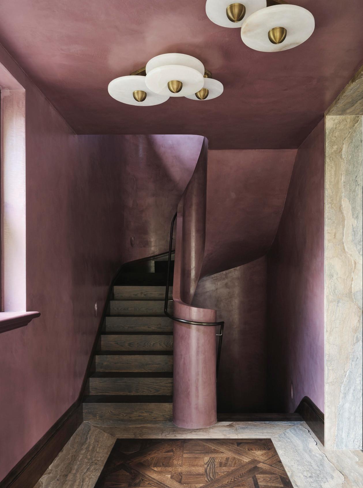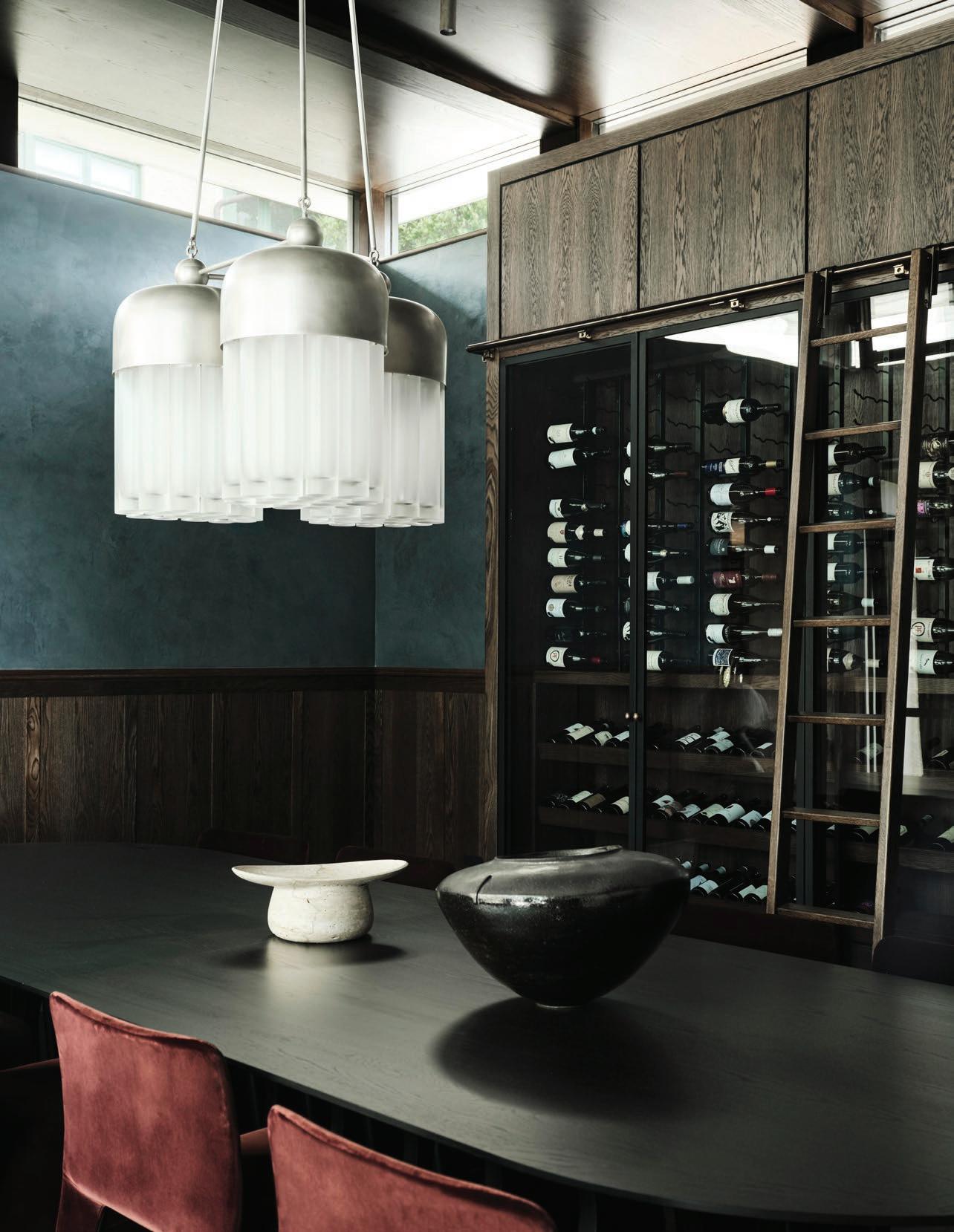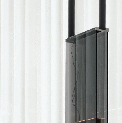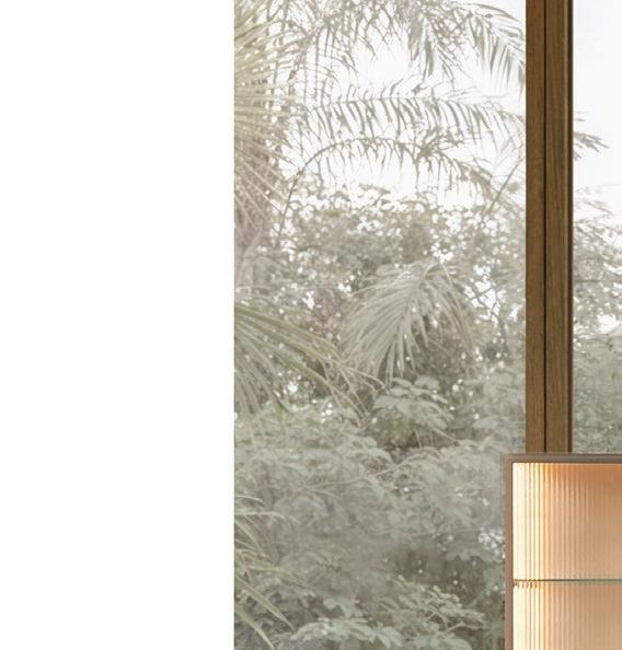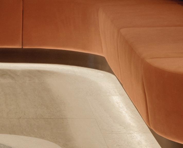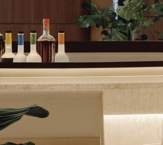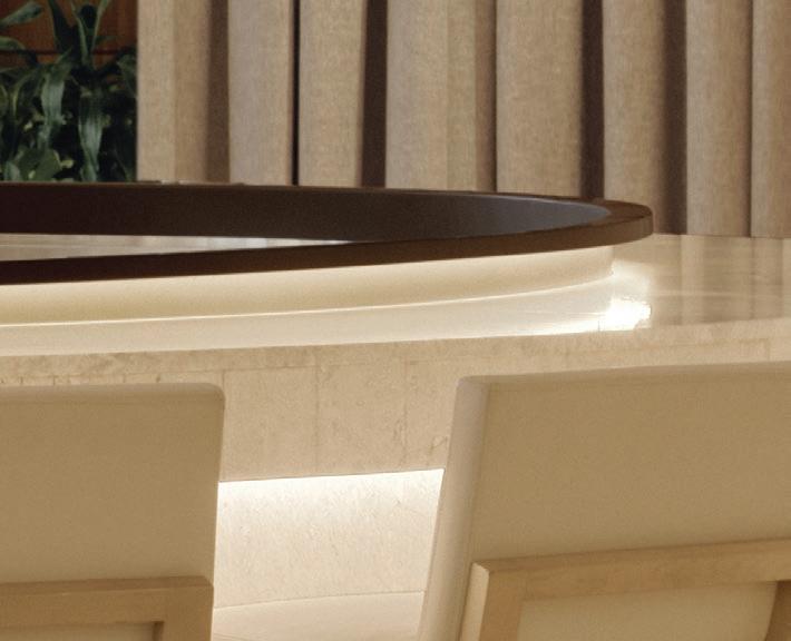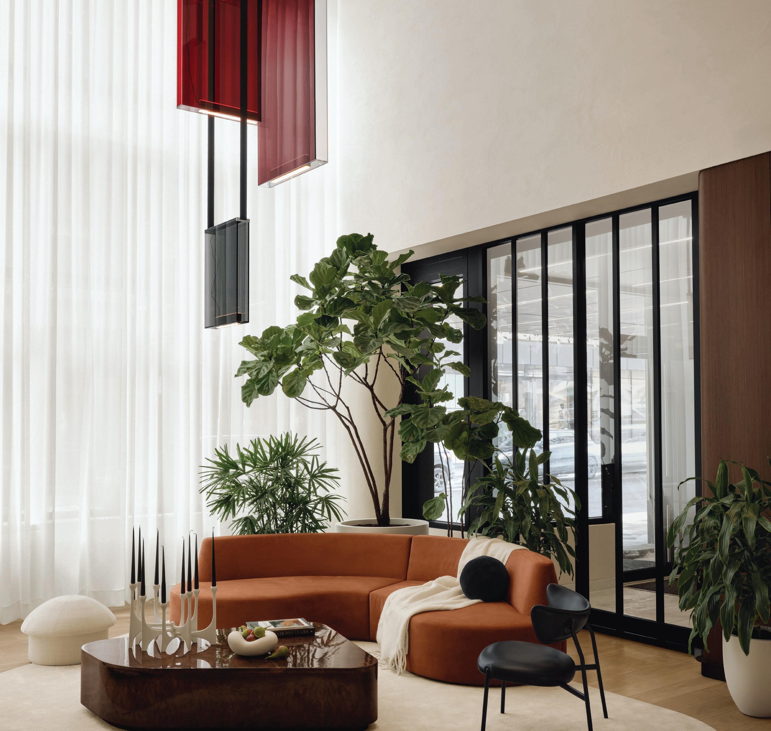 Las líneas curvas, los bordes suavizados y las superficies texturizadas permiten que la luz — natural de día, cálida y envolvente de noche— se deslice como pintura al óleo sobre un lienzo crudo, elevando visualmente los techos y acentuando la sensualidad del espacio. Dos monumentales instalaciones lumínicas de la colección Sainte, creadas por Lambert & Fils en colaboración con Sid Lee Architecture, coronan el conjunto, dialogando con una chimenea flotante revestida en bronce espejado que multiplica reflejos y profundidad.