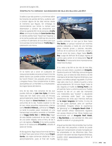 (proviene de la página 48)... Disfruta tu verano navegando de isla en isla en las BVI Si sabes a que isla quieres ir y te orientas sobre los horarios de partida del ferry, pudieras salir a conocer alguna de las islas vecinas desde el momento que llegues. Sin embargo, te recomendamos que tomes tu tiempo para desempacar y conocer las atracciones que ofrece la capital de BVI. Ve de compras a Crafts Alive, camina por la playa de Cane Garden Bay en donde podrás hacer “beach bar hopping”, y en la noche puedes salir a disfrutar de una cena y verificar el calendario de luna llena para que no te pierdas tremenda fiesta en Trellis Bay en celebración a la misma.