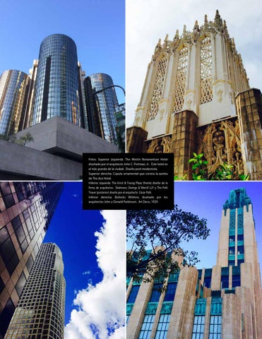 Fotos. Superior izquierda: The Westin Bonaventure Hotel diseñado por el arquitecto John C. Portman, Jr. Este hotel es el más grande de la ciudad. Diseño post-modernista. Superior derecha: Cúpula ornamental que corona la azotea de The Ace Hotel. Inferior izquierda: The Ernst & Young Plaza (frente) diseño de la firma de arquitectos Skidmore, Owings & Merrill LLP y The Pelli Tower (posterior) diseño por el arquitecto César Pelli. Inferior derecha: Bullocks Wilshire, diseñado por los arquitectos John y Donald Parkinson. Art Deco, 1929.