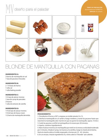 PROCEDIMIENTO: 1. Precaliente el horno a 350° y engrase un molde tamaño 9 x 13. 2. Derrita la mantequilla en un sartén a fuego mediano y tueste las pacanas hasta que manchen la mantequilla color marrón sin que se queme la mantequilla. (aprox. 13 min.) 3. Cuele las pacanas y enfríe la mantequilla en la nevera por 20 minutos. 4. Aparte, combine ingredientes B. 5. Bata el azúcar morena y la mantequilla que metió en la nevera a velocidad moderada por 3 minutos. Añada el syrop, los huevos y la vainilla y luego la mezcla de la harina. Vierta la mezcla sobre el molde engrasado y hornee por 35 - 40 minutos. 6. En un envase, mezcle ingredientes D y vierta sobre el “blondie” aún caliente.