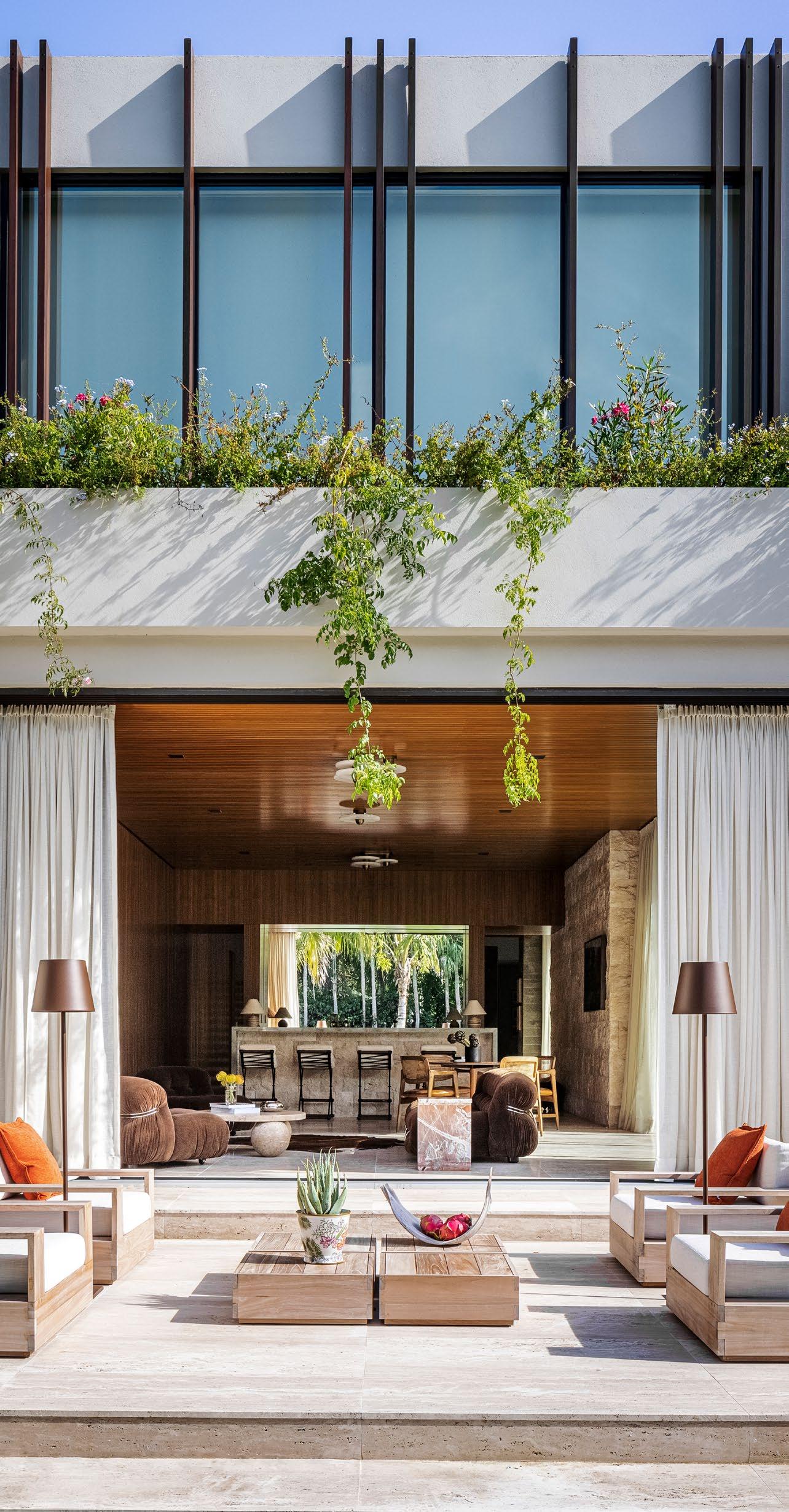 En esta residencia se destaca el uso del mármol travertino en los revestimientos de piso interior y exterior, así como techos y paredes en listones de teca para integrar textura y calidez. También incorpora materiales naturales fuertes como azulejos de Jerusalén cortados en bruto para las paredes exteriores, tableros de hormigón expuestos y acentos de carpintería de teca en toda la casa. Además de su enfoque en los materiales naturales, Strang Design prestó mucha atención al paisajismo, trabajando con el estudio de arquitectura paisajista La Casona Garden. Juntos, obtuvieron muchas especies nativas.