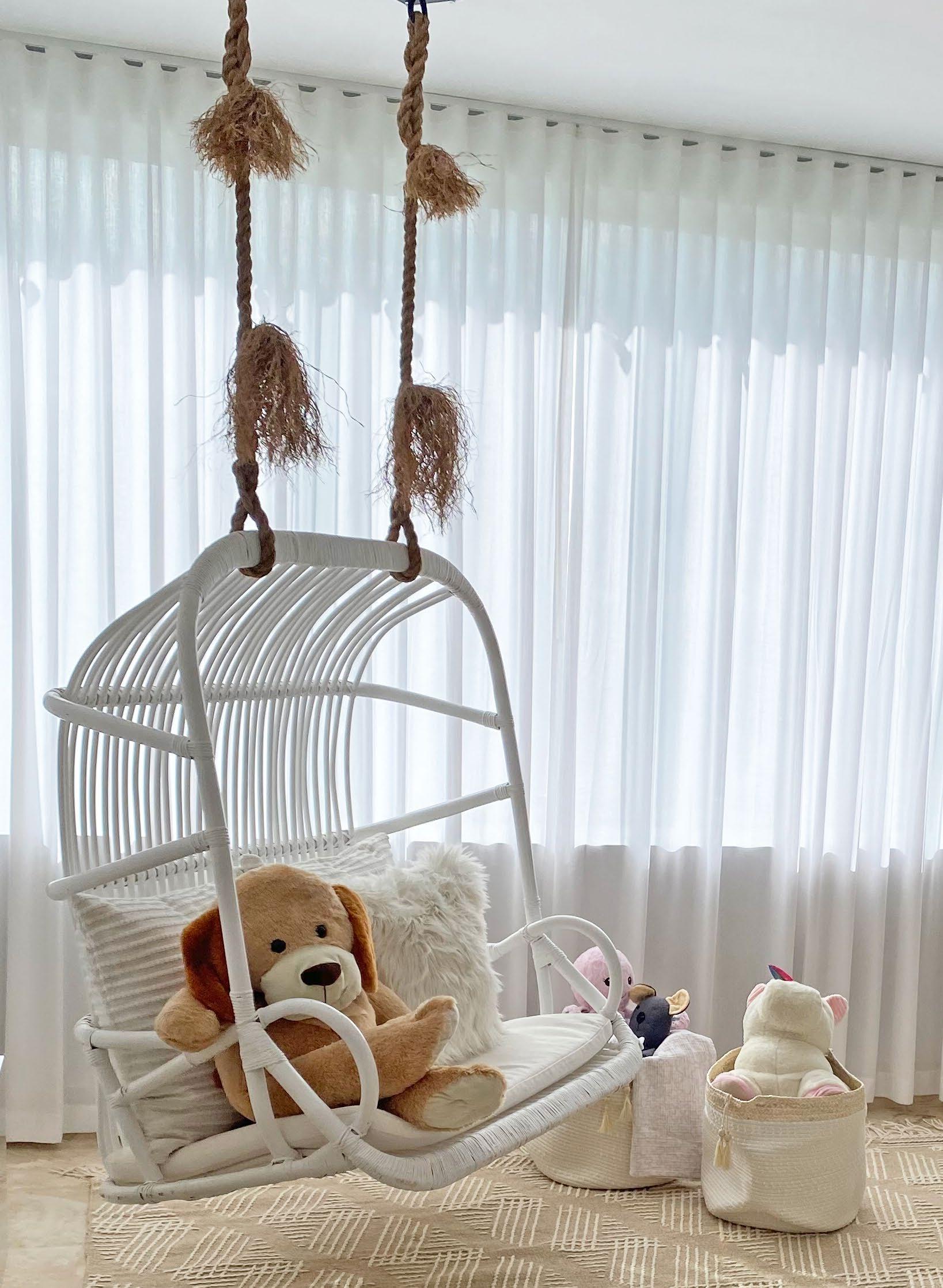 donde pequeños pájaros de colores alegran el panorama como un ambiente de encanto. Un sillón de ratán para mecer y peluches para jugar complementan el ambiente. Las notas musicales de la pared del escritorio y el banquito de cojín en lana nos hablan de la personalidad de quien disfruta la habitación.