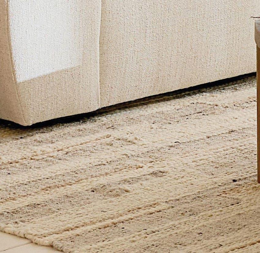 El sofá en particiones de tonos sólidos como el crema, gris y gris pardo, y la alfombra en rayas de colores, son suaves al tacto, mullidas para comodidad y encubren cualquier rastro de juego que pueda quedar en ellas. La lámpara es juguetona en forma y material; dinámica para hacer juego con el propósito de la habitación.