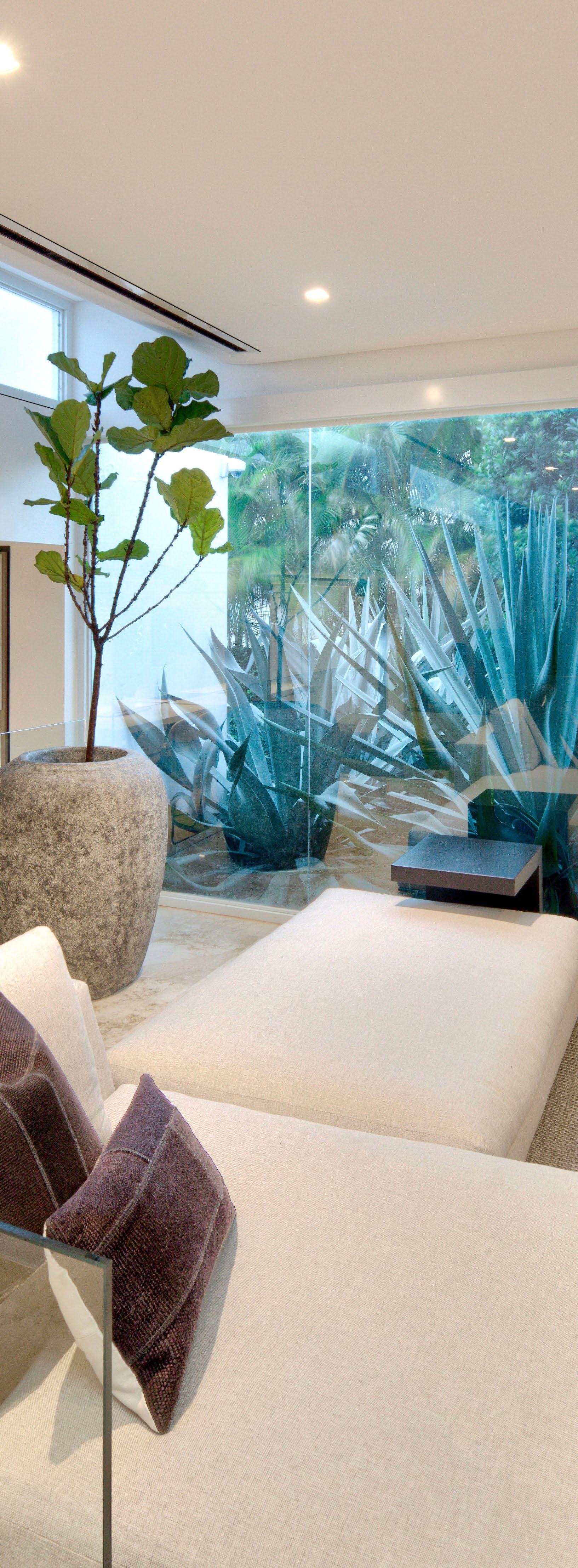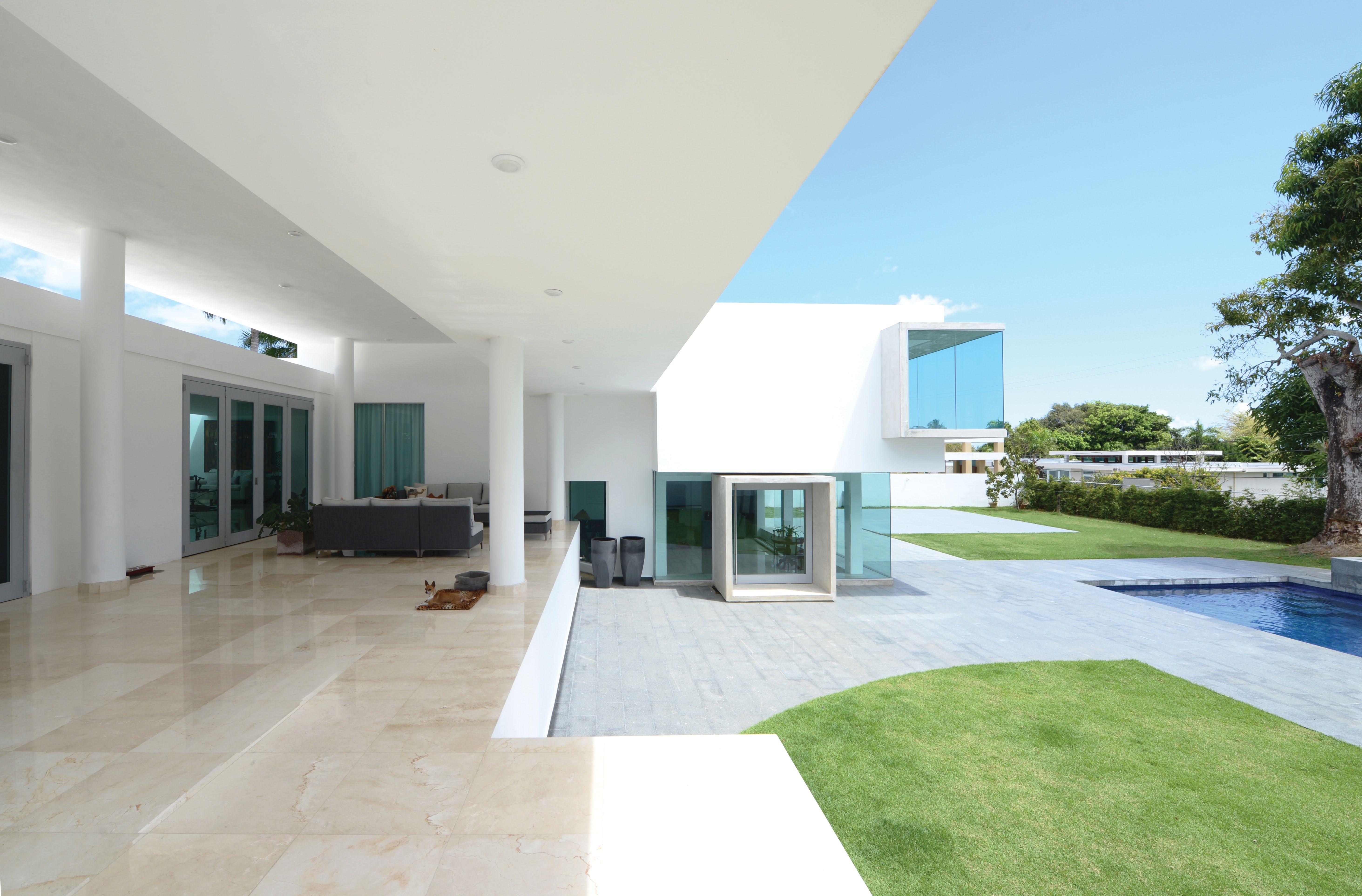 Miami-based Architect Max Strang, FAIA, of design studio Strang Design respects the environment through architecture and interior design. He highlights the use of travertine marble in the interior and exterior floor coverings, as well as teak slatted ceilings and walls to integrate texture and warmth. He also incorporates strong natural materials like rough-cut Jerusalem tiles for the exterior walls, exposed concrete decking, and teak millwork accents throughout the home. In addition, he paid a lot of attention to landscaping.