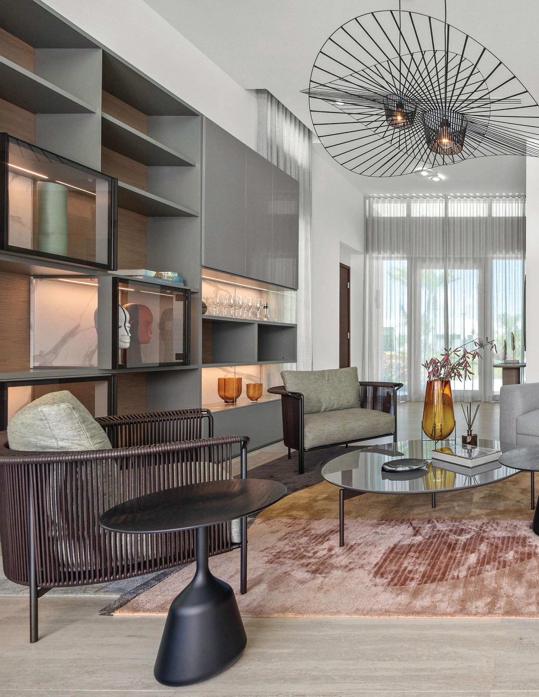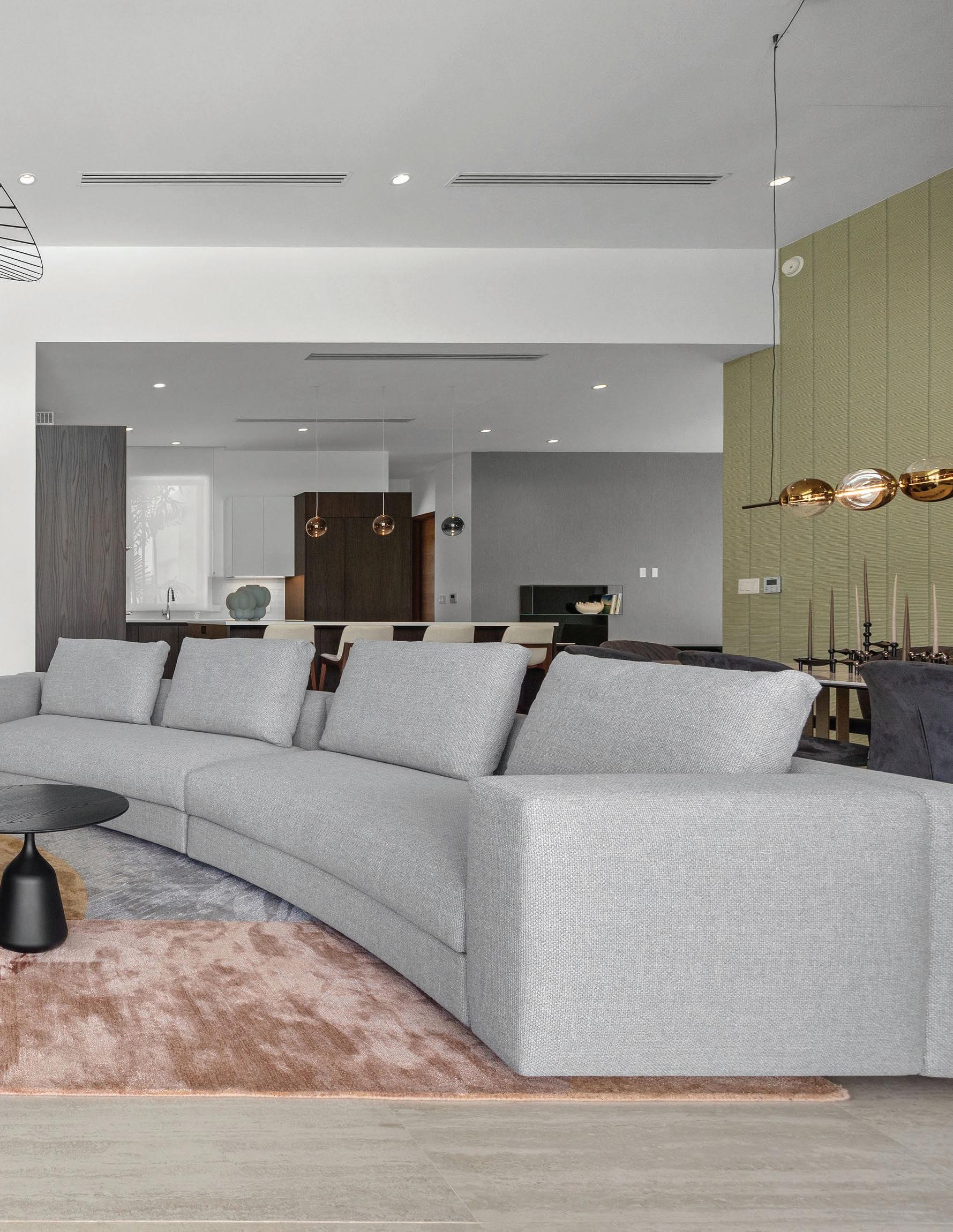 En la sala, el sofá de líneas suaves y acogedoras complementado por un conjunto de mesas de centro en acabados pulidos mate y una alfombra que brinda un toque de color, crean un ambiente de lujo discreto que invita a la conversación y el disfrute.