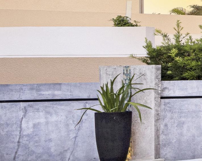 La entrada de la casa cuenta con una puerta pivotante de cristal transparente y una pared de fondo con textura de óxido. En esta área se trabajó un estilo limpio, utilizando grandes tiestos de Luminati montados en la pared para lograr un aspecto único.