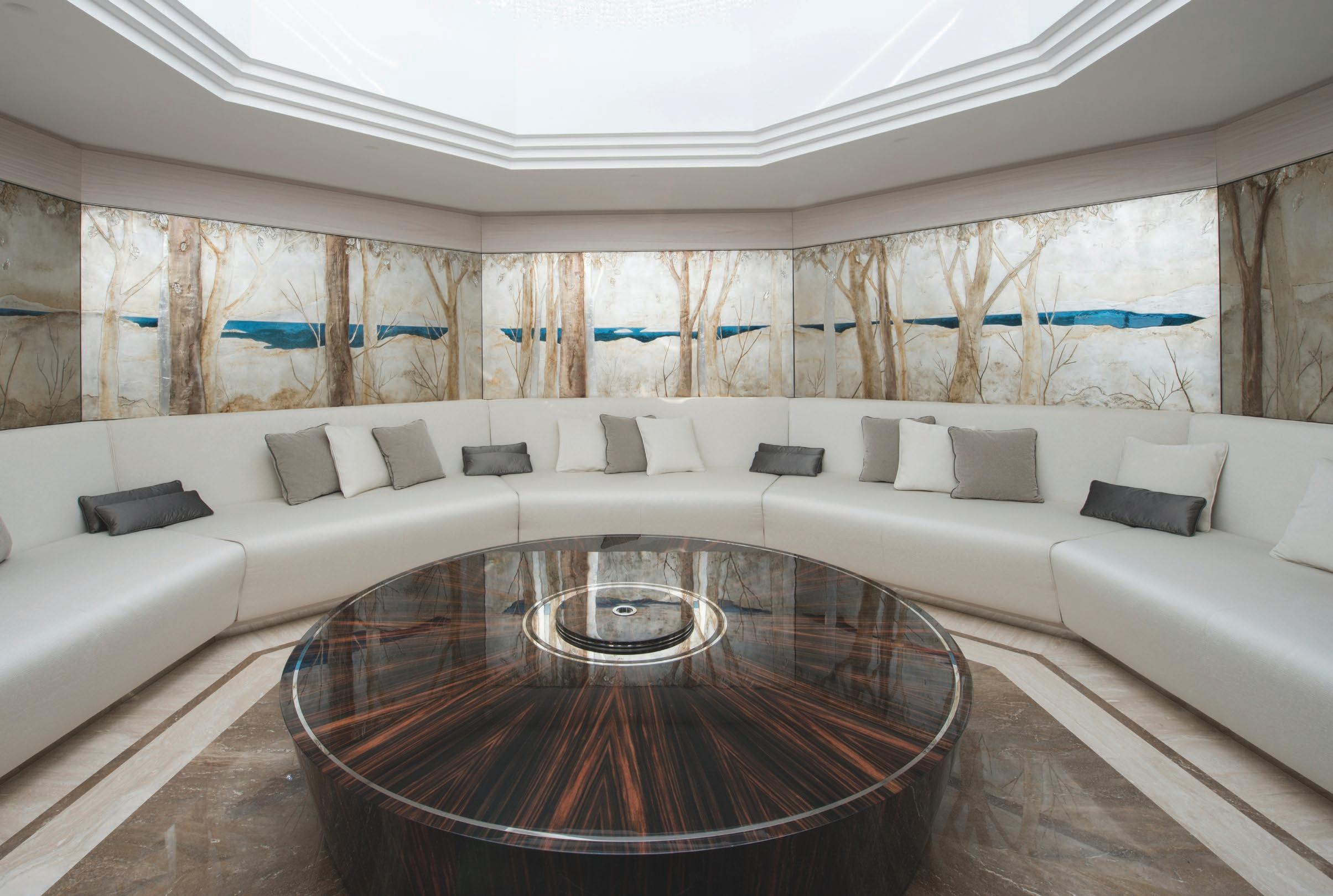 El equipo de Fabio Mazzeo trabajó el mobiliario realizado por los mejores artesanos italianos. Estas piezas únicas se yuxtaponen con joyas de diseño contemporáneo, como los asientos Living Divani en el área de la sala de estar.