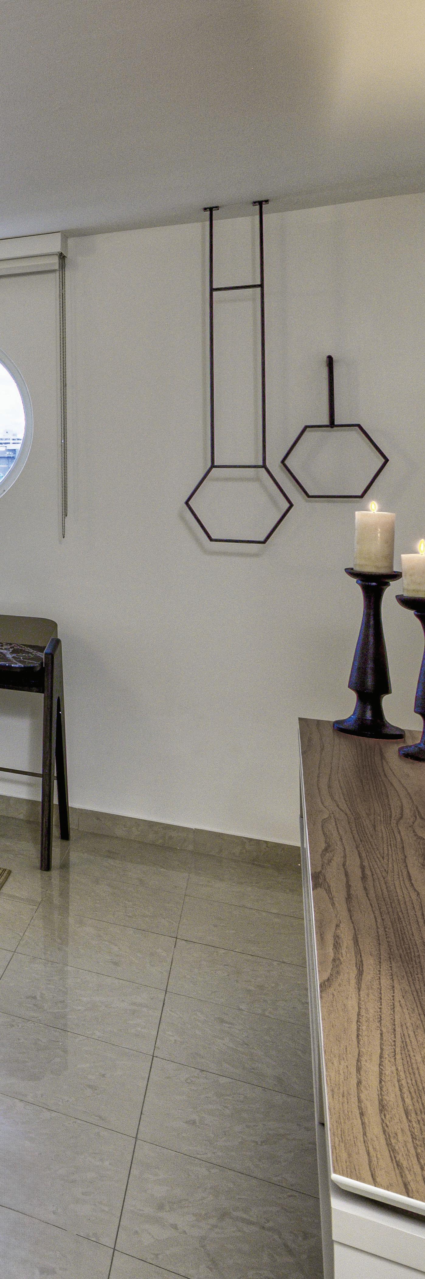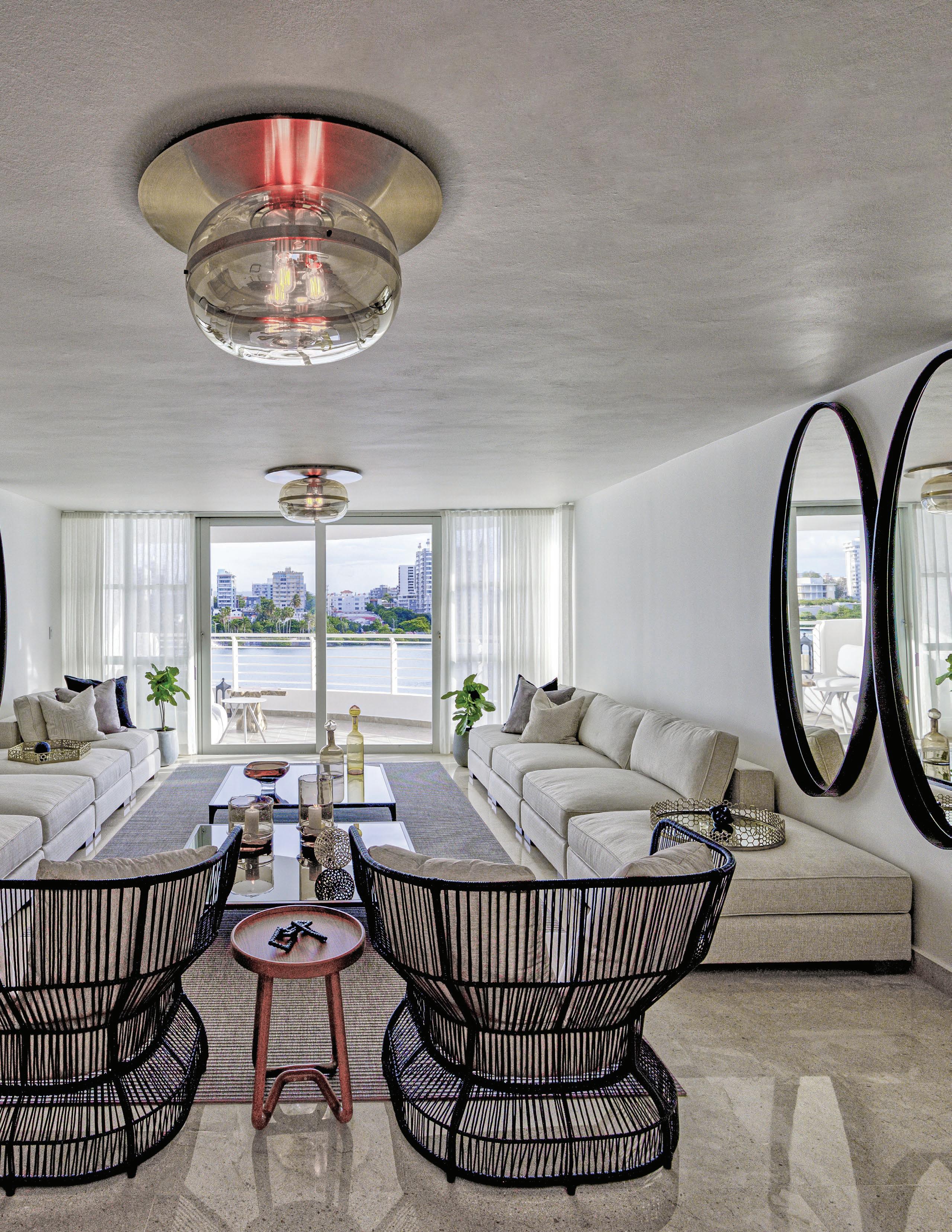 "We define this design by the dynamism created as the result of the combination of textures and finishes in a record time of three weeks", confirms architect Camille M. Colón Conde of Cube Architects. Following the trend of the moment, the firm used different woods and fabrics to add interest to the space. They stayed in the range of neutral tones in order to elegantly unify the space. Asymmetric mirrors for interest. Fabric dining chairs harmonize with the loungers in the living room. Reflective surfaces in dark tones. Layers of textures through the works of art, rugs and especially in accessories. Wooden elements in the hall provide architectural touches. Wise luminaires take advantage of different environments and the enjoyment of the view towards the lagoon in an urban horizon scenario.
