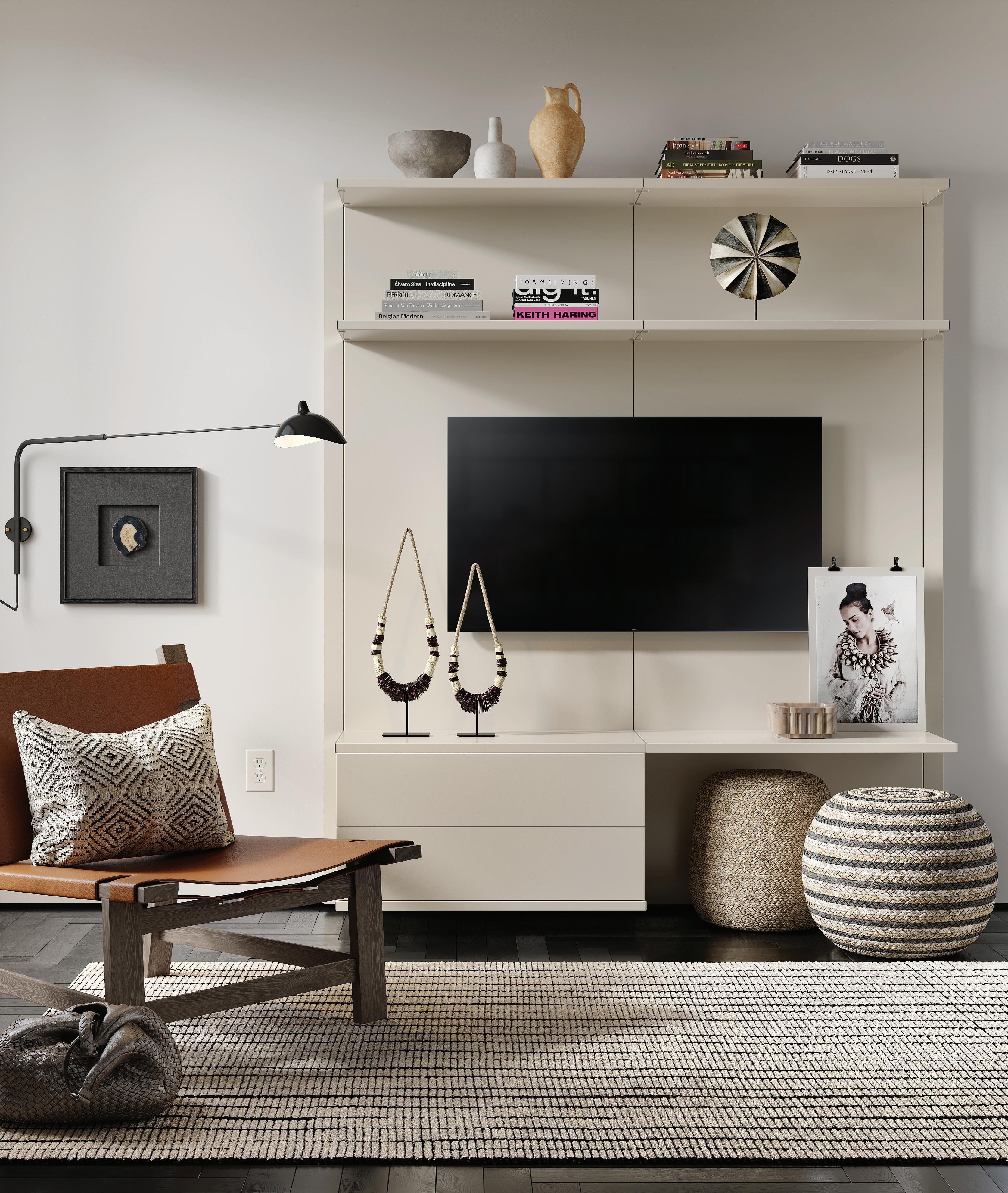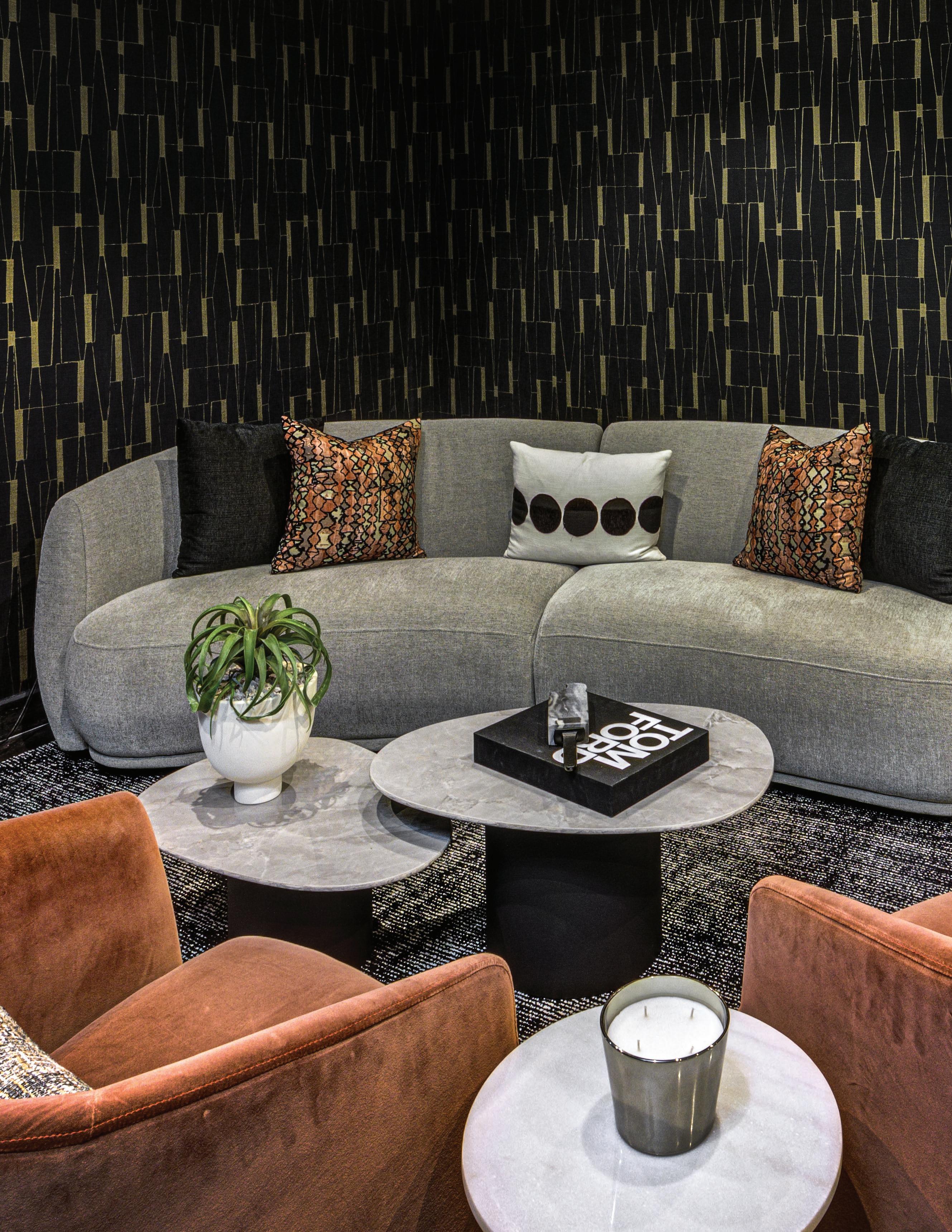Los espejos asimétricos de formas geométricas brindan amplitud e interés. Las sillas de comedor en tejidos armonizan con las tumbonas de la sala y contrastan con superficies reflectoras en tonalidades oscuras. Las capas de texturas se pueden ver a través de las obras de arte, alfombras y sobre todo en accesorios, que ofrecen un sentido acogedor a los espacios.