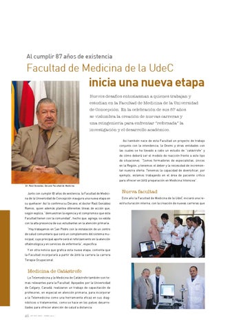 inicia una nueva etapa Nuevos desafíos entusiasman a quienes trabajan y estudian en la Facultad de Medicina de la Universidad de Concepción. En la celebración de sus 87 años se vislumbra la creación de nuevas carreras y una reingeniería para enfrentar “reforzada” la investigación y el desarrollo académico. Así también nace de esta Facultad un proyecto de trabajo conjunto con la intendencia, la Onemi y otras entidades con las cuales se ha llevado a cabo un estudio de “catástrofe” y de cómo deberá ser el modelo de reacción frente a este tipo de situaciones. “Somos formadores de especialistas, únicos en la Región, y tenemos el deber y la necesidad de incrementar nuestra oferta. Tenemos la capacidad de diversificar, por ejemplo, estamos trabajando en el área de paciente crítico para ofrecer en 2012 preparación en Medicina Intensiva”.