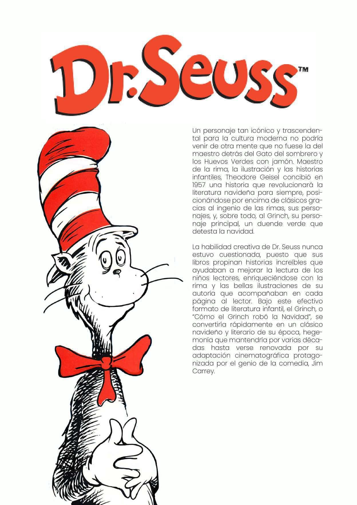 En 1957, el escritor y caricaturista, Dr. Seuss, con cibió una de las historias navideñas más popu lares mediante su labor literaria orientada al público infantil, sin esperar que su cuento y per sonaje, el Grinch, terminaría por convertirse en el favorito de una generación para representar las fiestas navideñas, personaje que trascend iera de las páginas ilustradas de un libro infantil a otros formatos como la animación, el cine y mucho, mucho más.