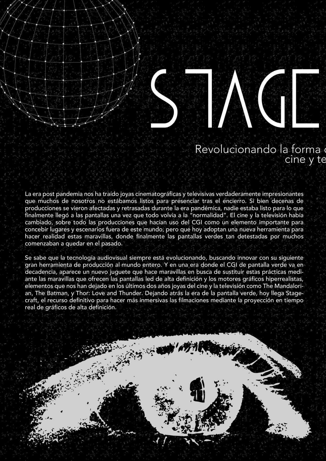 Stagecraft, como se le conoce a esta tecnología, es el gran avance tecnológico de la industria audiovisu al de la década. Se trata de una herramienta de proyecciones en tiempo real de gráficos computarizados de alta definición, los cuales son proyectados a través de pantallas led 4K alrededor de un set específico llamado The Volume. La tecnología permite proyectar entornos de cualquier tipo, desarrollados medi ante el motor gráfico Unreal Engine comúnmente utilizado en la concepción de videojuegos modernos, mismo que permite modificar en tiempo real lo que vemos en las pantallas según la necesidad de la cámara y la filmación.
