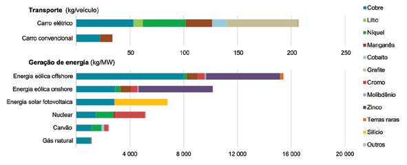 Dessa forma, é importante enfatizar que a simples presença de minerais na crosta terrestre não é suficiente. O verdadeiro desafio reside na extração e processamento deles, além da construção de uma infraestrutura de baixo carbono, que demandará grandes quantidades de metais, como alumínio, aço, cimento e metais de terras raras, bem como recursos específicos, como o polissilício para painéis solares, e o disprósio e neodímio para turbinas eólicas. Apesar de as reservas geológicas serem suficientes para atender à demanda até 2050, a mineração e o processamento desses materiais gerarão uma grande quantidade de resíduos no ar, na terra e na água. Esse desafio se agrava no contexto de sistemas de armazenamento, principalmente baterias, cuja produção de grafite, lítio e cobalto precisará de um aumento de aproximadamente 450% até 2030, quando comparado aos níveis de 2018.