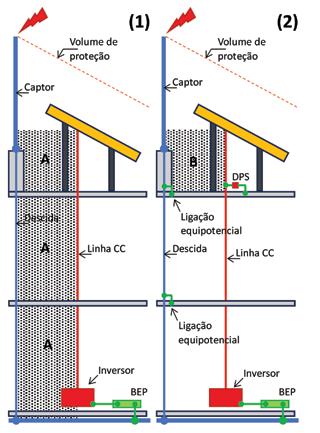 equipotencialização: na situação 2, foram realizadas ligações equipotenciais entre o SPDA (direta) e a linha CC (via DPS) com as armaduras de aço da estrutura. Essas conexões reduzem o laço de indução, restringindo-o à área hachurada B.