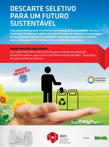 DESCARTE SELETIVO PARA UM FUTURO SUSTENTÁVEL Faça parte deste grande movimento pela educação do consumidor. Inclua a simbologia de descarte seletivo e de identificação de materiais na embalagem do seu produto e oriente o seu descarte adequado, separando os resíduos secos (embalagens) dos úmidos (resto de alimentos e outros). Acesse www.abre.org.br/pacto