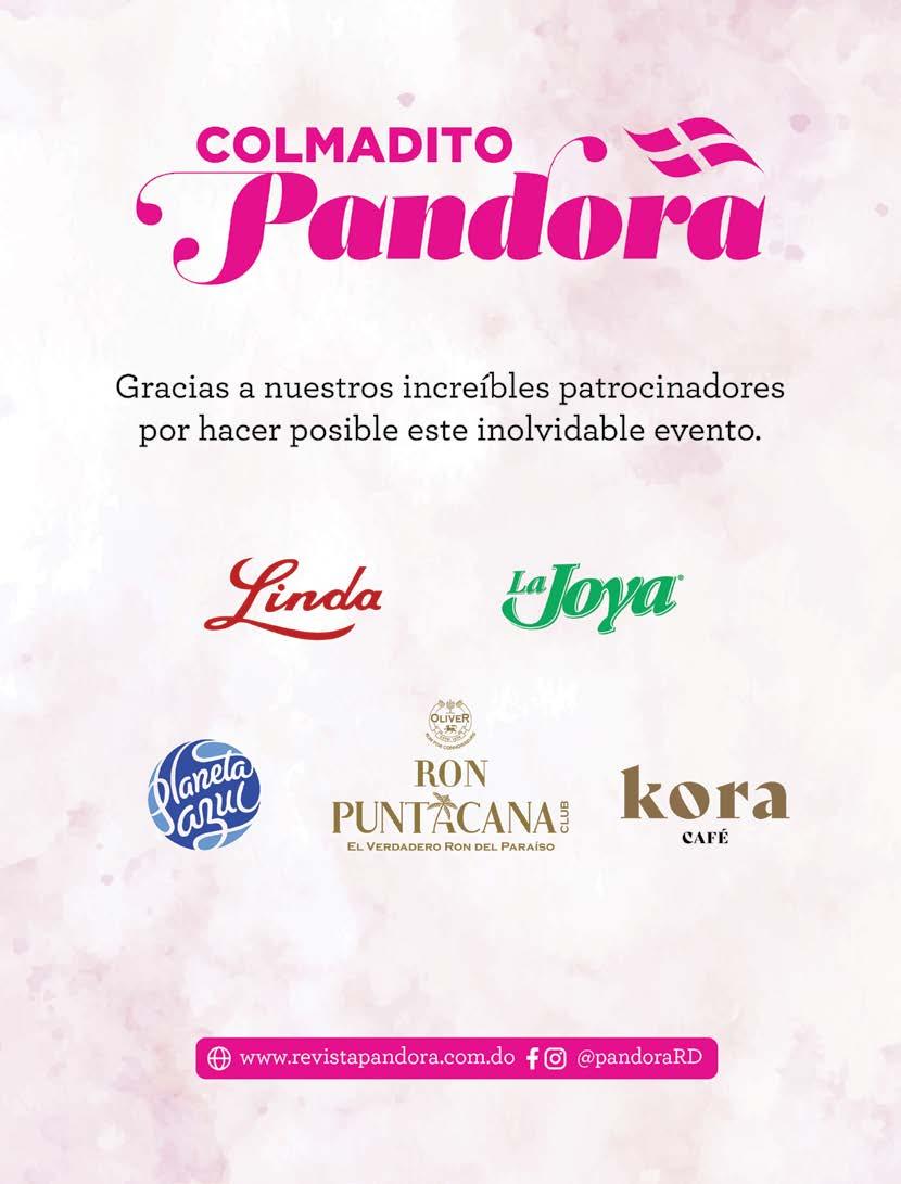 Equipo Pandora DIRECCIÓN DE REVISTAS Y EDICIÓN Airam Toribio. DISEÑADORES Glennys Crisóstomo e Iván Mieses. REDACTORAS Pamela Toribio, Sophia Sanabria, Maryorie Peña Castellanos, Marcelle Cordero y Susana Pujals. COLABORADORES Enyer Díaz, Petite Jolie RD, Ana Victoria Torres y Wildania Peralta. VENTAS Annetty Aquino.