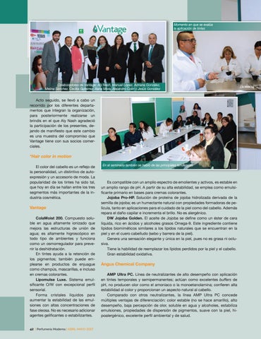 Vantage ColaMoist 200. Compuesto soluble en agua altamente ionizado que mejora las estructuras de unión de agua; es altamente higroscópico en todo tipo de ambientes y funciona como un osmorregulador para prevenir la deshidratación. En tintes ayuda a la retención de los pigmentos; también puede emplearse en productos de enjuague como champús, mascarillas, e incluso en cremas colorantes. Lipomulse Luxe. Sistema emulsificante O/W con excepcional perfil sensorial. Forma cristales líquidos para aumentar la estabilidad de las emulsiones con altas concentraciones de fase oleosa. No es necesario adicionar agentes gelificantes o estabilizantes. 42 | Perfumería Moderna | ABRIL-MAYO 2017