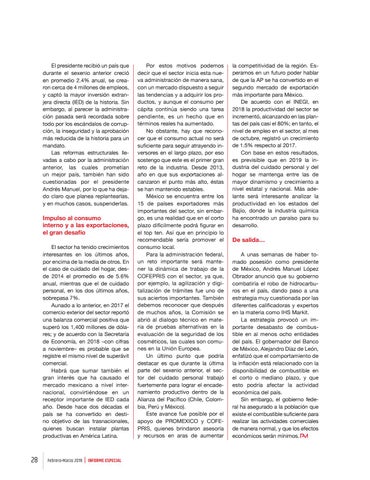 la competitividad de la región. Esperamos en un futuro poder hablar de que la AP se ha convertido en el segundo mercado de exportación más importante para México. De acuerdo con el INEGI, en 2018 la productividad del sector se incrementó, alcanzando en las plantas del país casi el 80%; en tanto, el nivel de empleo en el sector, al mes de octubre, registró un crecimiento de 1.5% respecto al 2017. Con base en estos resultados, es previsible que en 2019 la industria del cuidado personal y del hogar se mantenga entre las de mayor dinamismo y crecimiento a nivel estatal y nacional. Más adelante será interesante analizar la productividad en los estados del Bajío, donde la industria química ha encontrado un paraíso para su desarrollo.