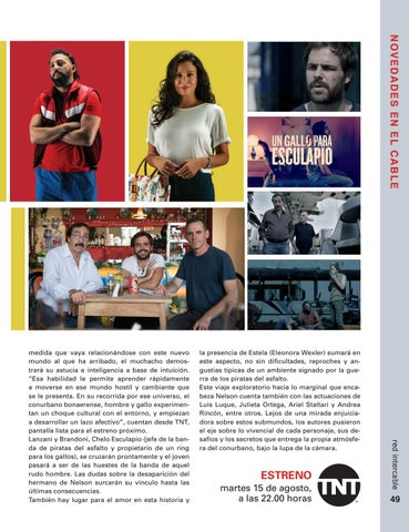 medida que vaya relacionándose con este nuevo mundo al que ha arribado, el muchacho demostrará su astucia e inteligencia a base de intuición. “Esa habilidad le permite aprender rápidamente a moverse en ese mundo hostil y cambiante que se le presenta. En su recorrida por ese universo, el conurbano bonaerense, hombre y gallo experimentan un choque cultural con el entorno, y empiezan a desarrollar un lazo afectivo”, cuentan desde TNT, pantalla lista para el estreno próximo. Lanzani y Brandoni, Chelo Esculapio (jefe de la banda de piratas del asfalto y propietario de un ring para los gallos), se cruzarán prontamente y el joven pasará a ser de las huestes de la banda de aquel rudo hombre. Las dudas sobre la desaparición del hermano de Nelson surcarán su vínculo hasta las últimas consecuencias. También hay lugar para el amor en esta historia y
