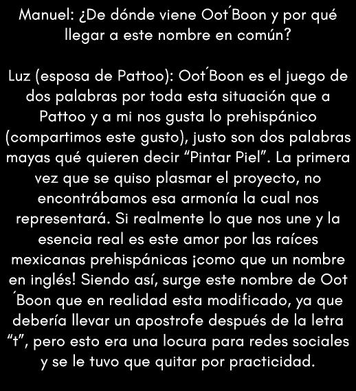 Antonio Veliz, mejor conocido como Pattoo, inició en el mundo de la perforación corporal en el año en el mundo de la perforación corporal en el año 1997. Su primer acercamiento como ejecutor de 1997. Su primer acercamiento como ejecutor de tatuaje lo realizó en el Estado de Quintana Roo; sin tatuaje lo realizó en el Estado de Quintana Roo; sin embargo, fue hasta el año 2015 que formalizó su embargo, fue hasta el año 2015 que formalizó su proyecto de estudio de tatuaje Oot Boon en la ciudad proyecto de estudio de tatuaje Oot Boon en la ciudad de Durango, su lugar de nacimiento. de Durango, su lugar de nacimiento.
