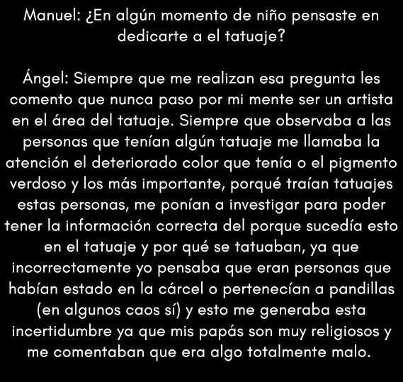 Ángel: Mi mayor sacrificio ha sido el tiempo; ya que no estoy con mi familia al 100%, me he perdido de salidas con amigos, he perdido amigos y me he ausentado de mis padres, todo debido a mi trabajo que sé que está valiendo totalmente la pena cada ocasión que he cancelado para prepararme, seguir aprendiendo y ser el mejor tatuador del mundo en mi estilo y en este bonito arte del tatuaje.