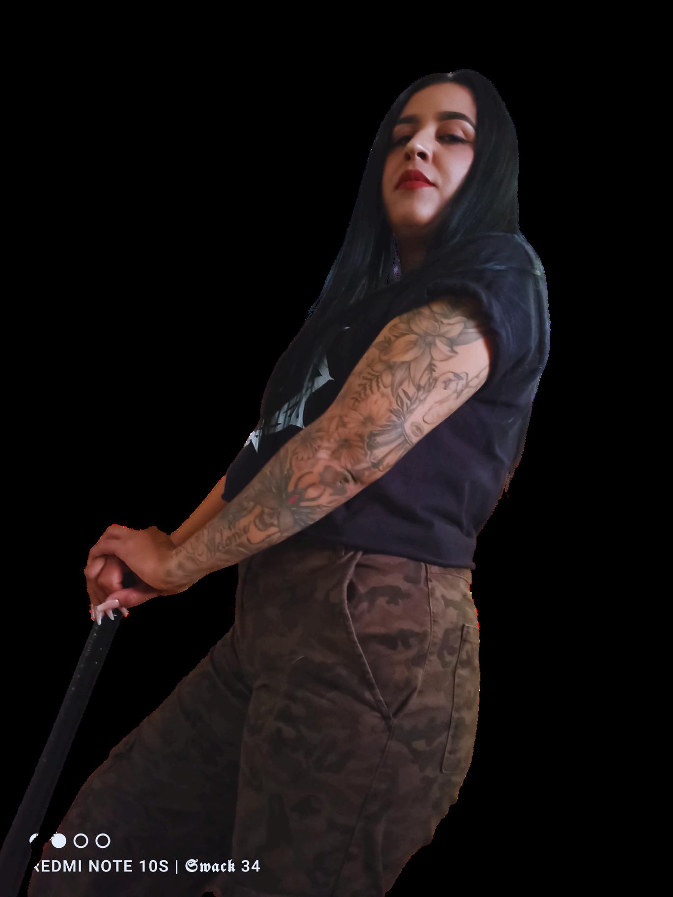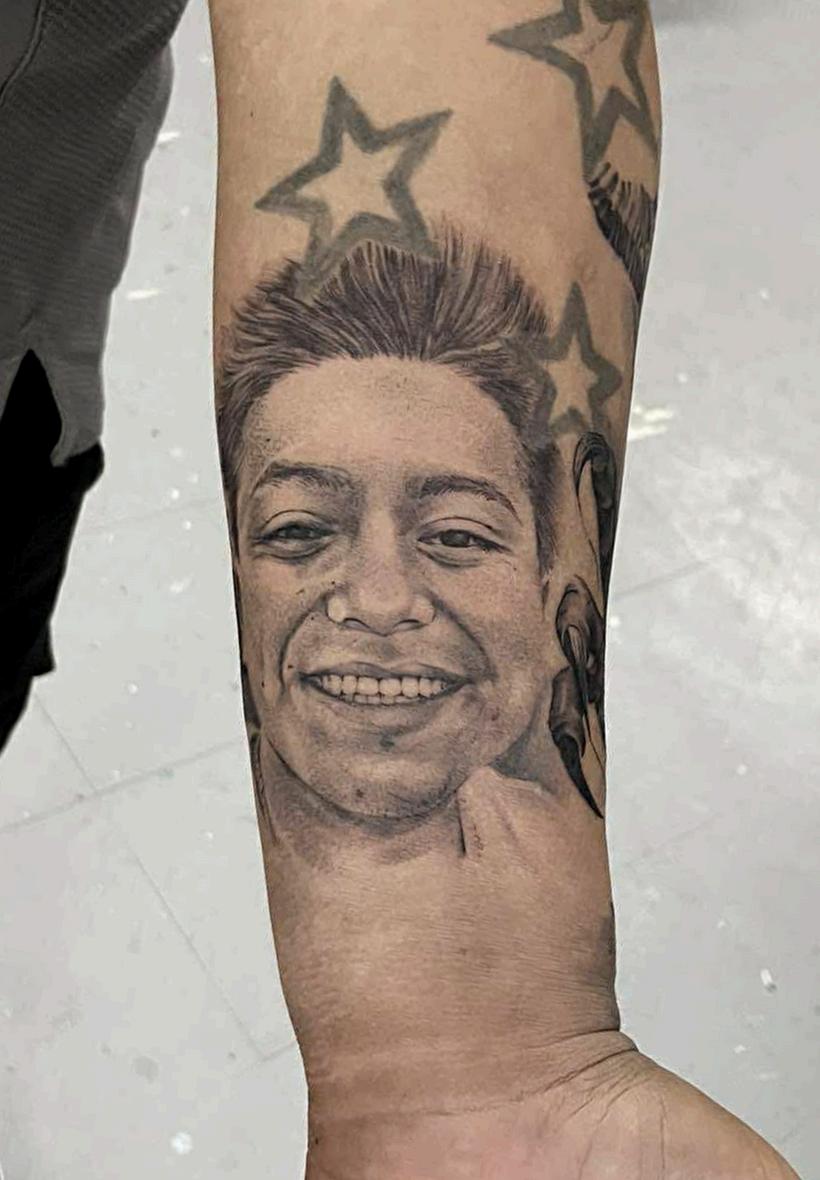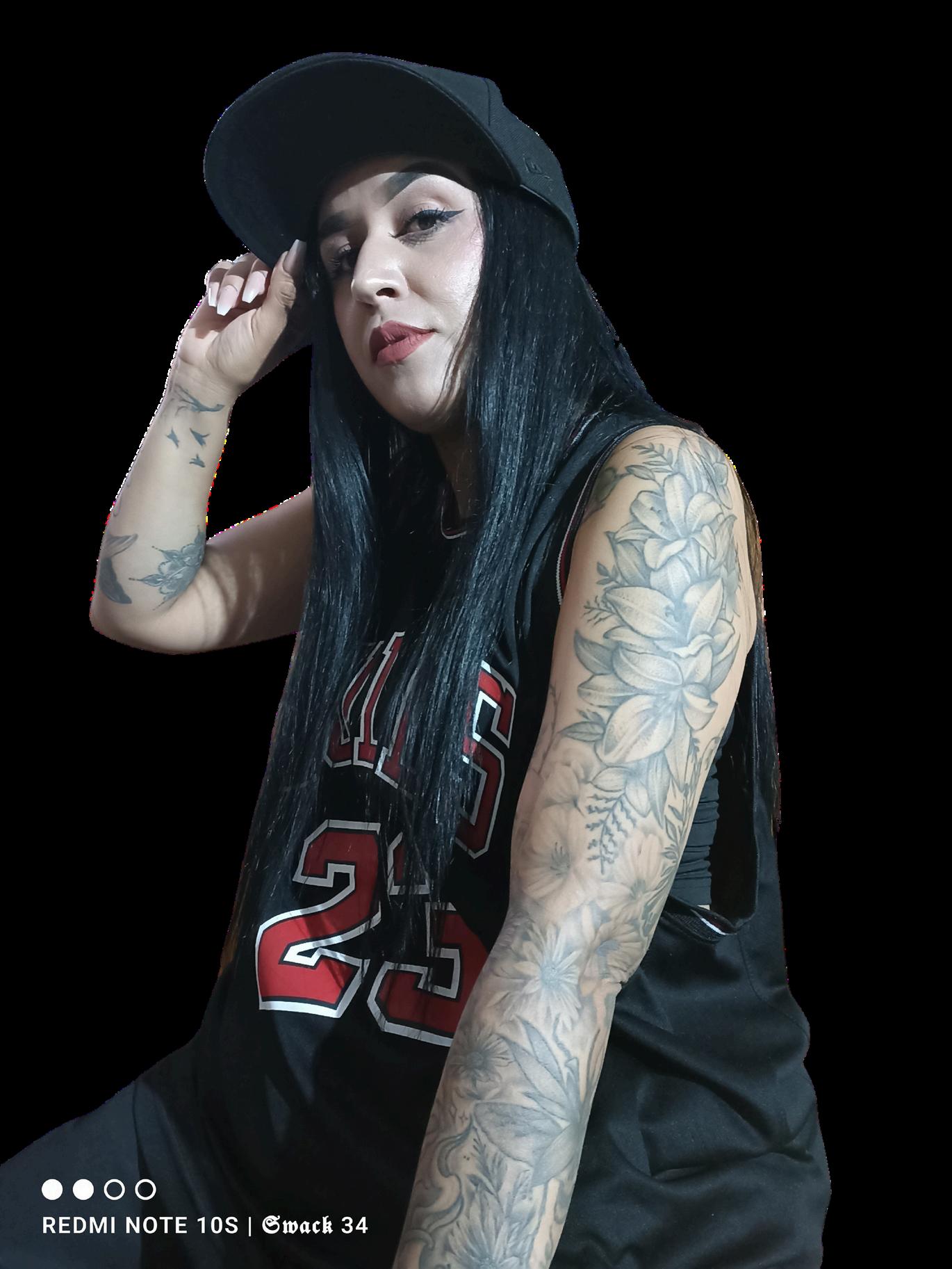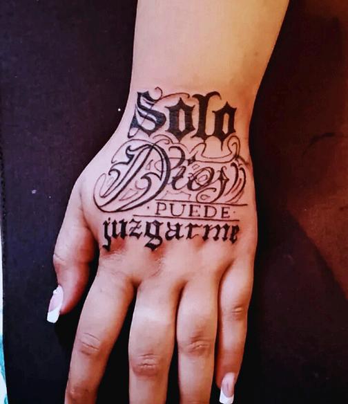 Hoy llevo varios tatuajes,y todos —sin excepción— han sido realizados por mi esposo, Swack Macías. Aún me quedan espacios, aún hay proyectos esperando su turno. El primero que él me tatuó fue el nombre de mi hija,uno de los más significativos para mí, junto con el nombre de mi segundo hijo.