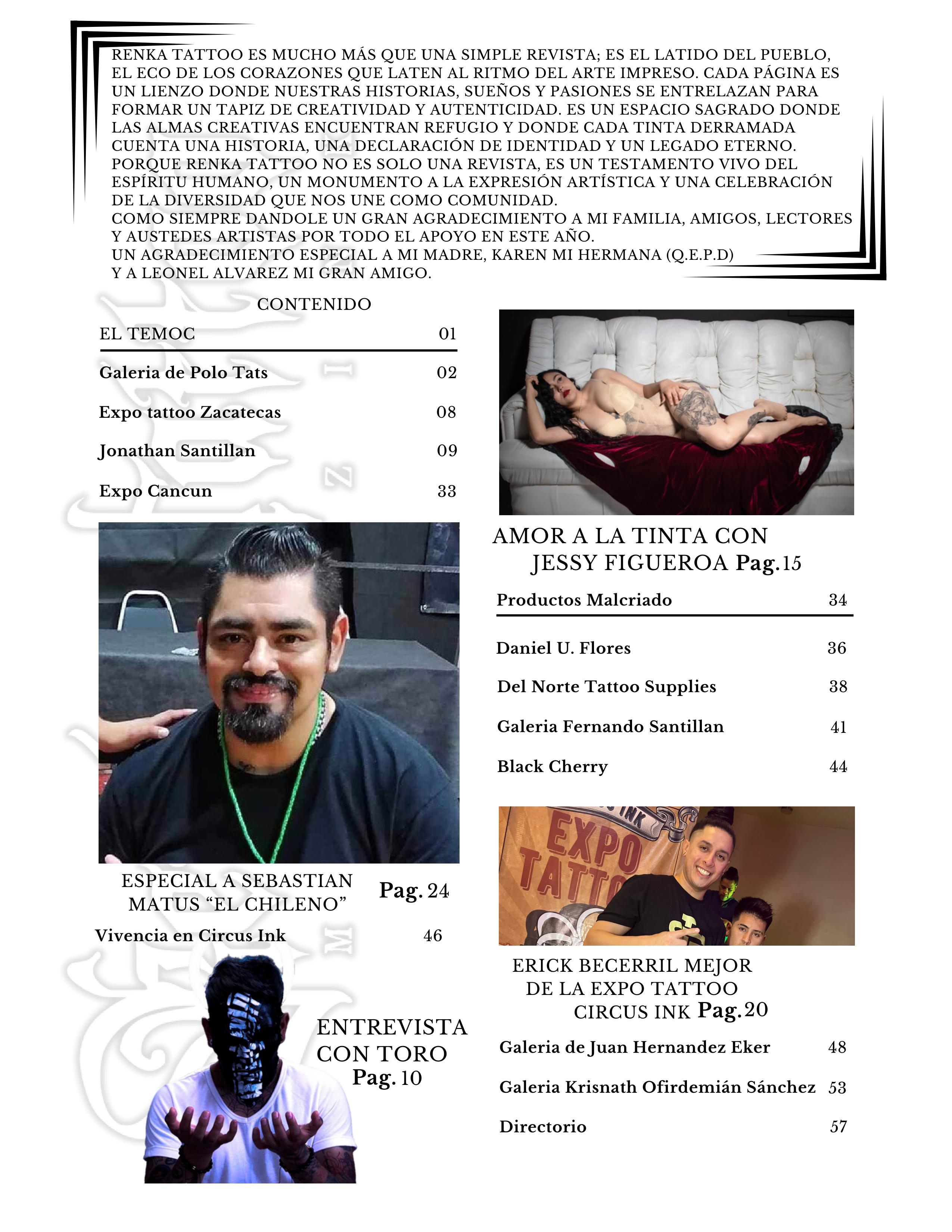 Renka Tattoo es mucho más que una simple revista; es el latido del pueblo, el eco de los corazones que laten al ritmo del arte impreso. Cada página es un lienzo donde nuestras historias, sueños y pasiones se entrelazan para formar un tapiz de creatividad y autenticidad. Es un espacio sagrado donde las almas creativas encuentran refugio y donde cada tinta derramada cuenta una historia, una declaración de identidad y un legado eterno. Porque Renka Tattoo no es solo una revista, es un testamento vivo del espíritu humano, un monumento a la expresión artística y una celebración de la diversidad que nos une como comunidad.