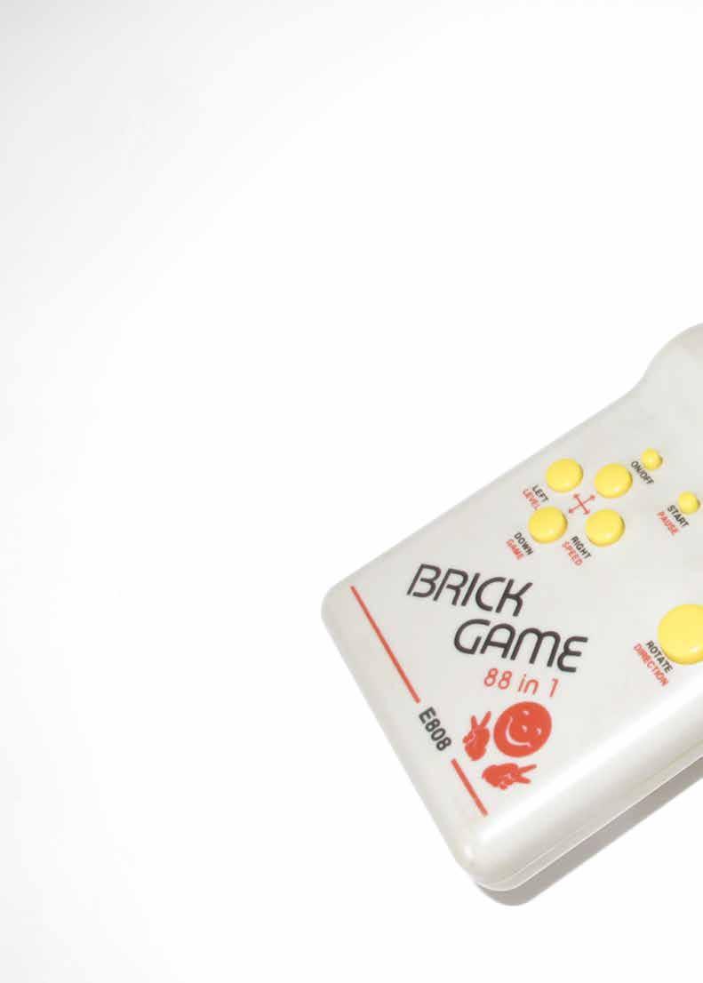El Brick Game tiene una pantalla de cristal líquido con gráficos pixelados, d-pad, botones de seteo, selección de nivel y velocidad. De peso liviano, corre con dos pilas AA, que garantizan muchas horas de funcionamiento. Nos ofrece un ilusorio 9999 en 1, que en realidad se limita a un par de juegos y variaciones de estos. Son adaptaciones de clásicos como Tetris, Frogger y Breakout , juegos de carreras y hasta La Viborita . El puzzle soviético tiene piezas con formas y poderes exclusivos de esta portátil. En la versión del Frogger hay que ponerle mucha imaginación para visualizar a una rana en esos píxeles, pero engancha tanto como el original. Y La Viborita marcó el inicio de una adicción que trascendió el ladrillo.