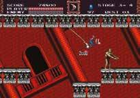 Claro que, si hablamos de consolas de 16 bits, no podemos olvidarnos del rival del momento de la gran N, Sega. En lugar de tirarse a hacer un port del juego que publicó en SNES, el equipo de Konami desarrolló un juego completamente diferente para la Génesis, el Castlevania: Bloodlines (1994, conocido en Japón como Vampire Killer), con personajes nuevos que se adentraban en el castillo de Drácula y sus alrededores. Así, en Sega no vamos a controlar a un descendiente del clan Belmont, sino a John Morris (que se controla igual que un Belmont, con látigo y todo) y su amigo Eric Lecarde (que usa la lanza de Alucard, el hijo de Drácula que conocimos en el Dracula’s Curse) a lo largo de seis niveles con sus respectivos jefes al final. Los desarrolladores también quisieron sacarle todo el jugo a la consola de Sega, dejándonos con niveles geniales como la torre que se inclina de izquierda a derecha a medida que subimos. Una curiosidad de los juegos de SNES y