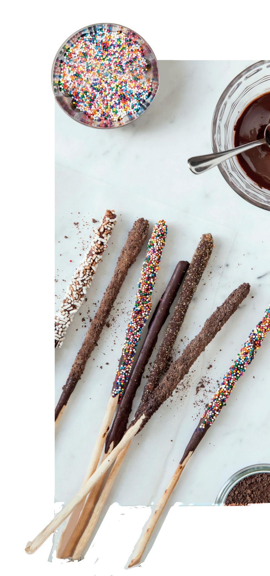 Após o preparo da massa, derreta o chocolate em banho maria. Agora é só passar os palitos no chocolate, exceto uma borda e depois no confeito para que esteja pronto. Dica 1