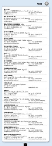 BCD S.R.L. 3 de Febrero 312 (S2000BKH) Rosario - Pcia. de Santa Fe - Argentina Tel: +54 (341) 425-0040 Fax: +54 (341) 421-9629 info@bcd.com.ar www.bcd.com.ar BVS TELEVISION SRL Av. Díaz Vélez 3965 PB - C.A.B.A. (1200) - Argentina Tel: +54 (11) 4958-5638 Fax: +54 (11) 4958-5638 info@bvstv.com www.bvstv.com DBA SYSTEMS (SOUND CORP S.R.L.) Av. Díaz Velez 4066 (C1200AAU) C.A.B.A. - Argentina Tel: +54 (11) 4545-6800 (Lín. rot.) Fax: +54 (11) 4545-3668 sales@dbasys.com www.dbasys.com DEXEL LIGHTING Av. General Paz 13130 (1440) - C.A.B.A. - Argentina Tel: +54 (11) 4687-3001 Fax: +54 (11) 4687-7550 sales@dexel.com www.dexel.com DIGITAL CENTER Lima 29 Piso 3º Of. K (C1073AAA) - C.A.B.A. - Argentina Tel: +54 (11) 4383-9989 Fax: +54 (11) 4383-9989 digitalcenter@digitalcenter.tv www.digitalcenter.tv DIGITAL VIDEO VICARIO Ocampo 224 (2000) – Rosario - Argentina Tel: +54 (341) 481-2332 info@vicariodigital.com