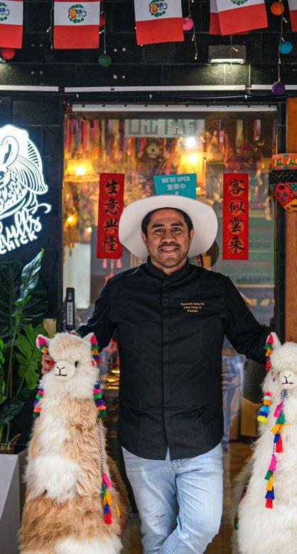 con la comunidad local, Chullschick colabora con artistas hongkoneses. El menú está ilustrado a mano por Eva, una artista local, y la decoración evoca una yunza andina, con cintas, piñatas y colores que hacen que entrar al restaurante sea una fiesta.
