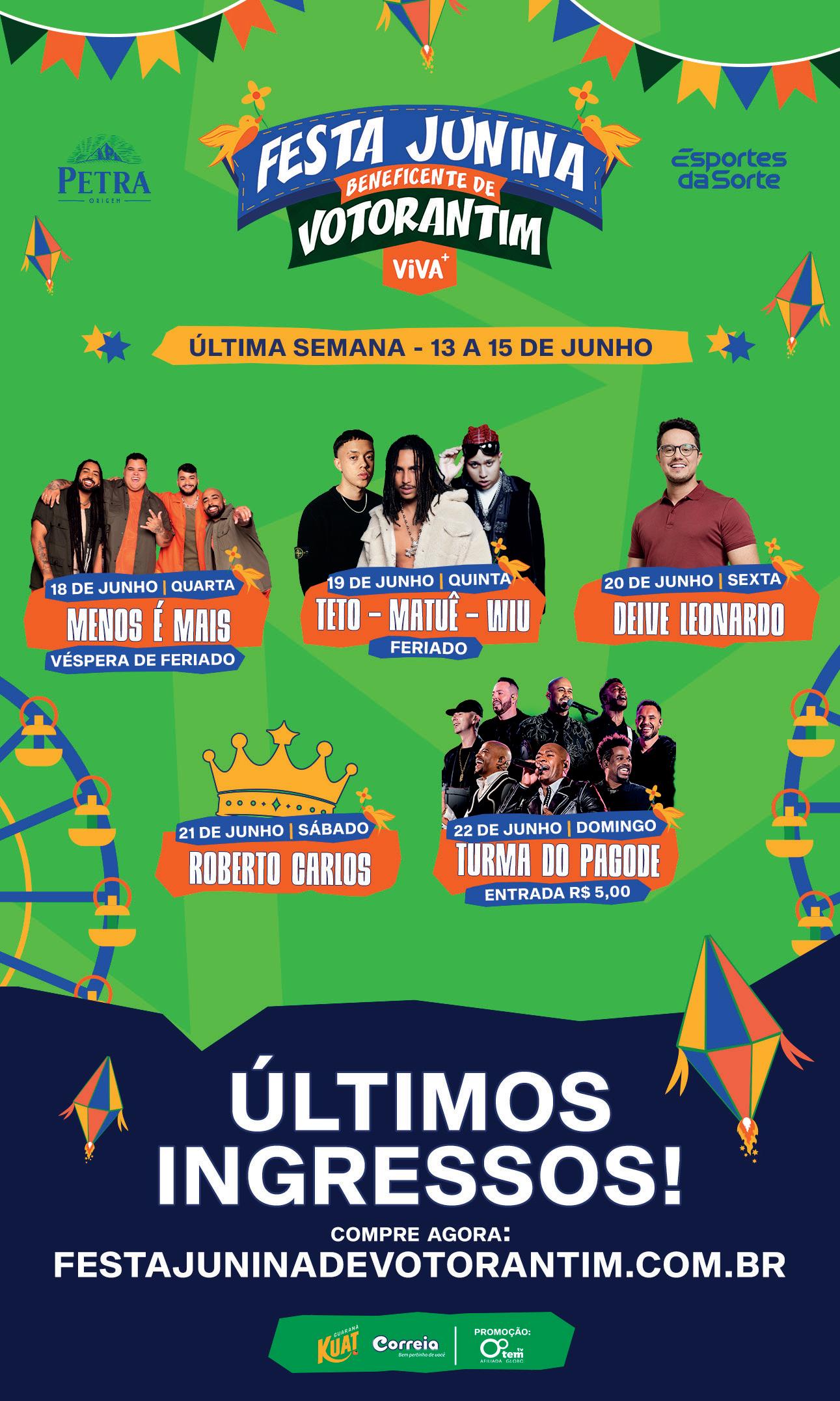 O fim de semana promete movimentar Votorantim com as últimas atrações da Festa Junina Beneficente 2025. Depois de mais de 20 dias de programação, o evento chega à reta final com nomes de peso, incluindo o aguardado show de Roberto Carlos, que sobe ao palco principal no sábado (21). No domingo (22), a despedida da festa será ao som da Turma do Pagode, com um repertório recheado de sucessos para os fãs de samba e pagode.