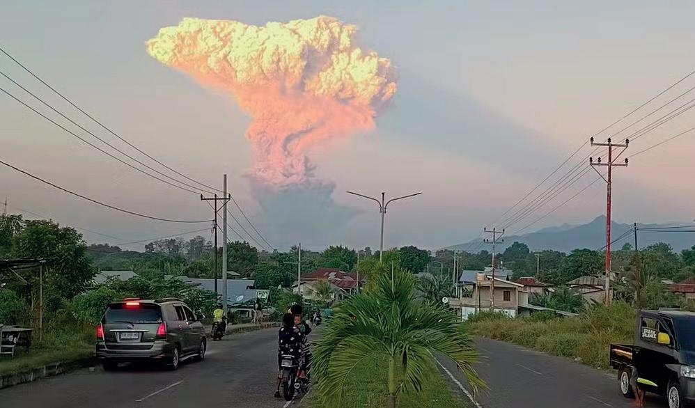 Nuvem rosada ilumina o céu em dramaticidade: coluna de cinzas e gases tingida por reflexos solares após a erupção do vulcão Monte Lewotobi Laki-Laki, em Maumere, na Indonésia, registrado nesta terça-feira (17).