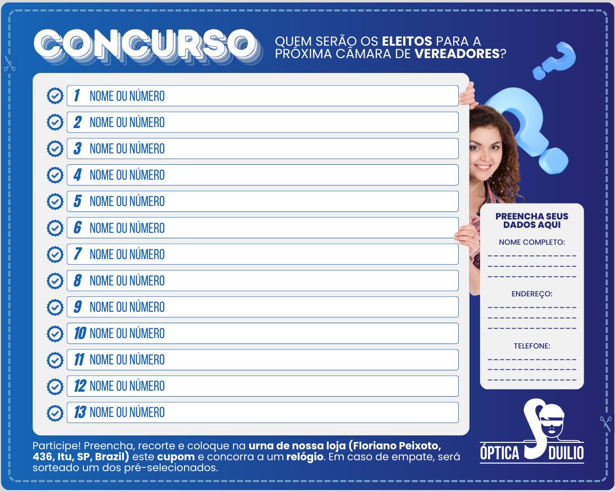 A Óptica Duilio, situada na Rua Floriano Peixoto, 436, no centro de Itu, está promovendo um concurso exclusivo que promete agitar os eleitores da cidade. Intitulada "Quais serão os eleitos para a próxima Câmara de Vereadores da cidade?", a iniciativa convida os participantes a fazerem suas previsões sobre os futuros vereadores de Itu. Para participar, o leitor deve recortar a lista disponível nesta edição do jornal, onde poderá registrar seus 13 palpites com os nomes dos candidatos que acredita que serão eleitos. Após preencher a lista com os candidatos escolhidos,