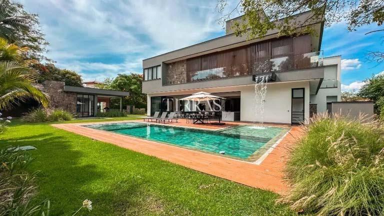 Mansão no Condomínio Terras de São José I, em Itu São 1 525 m² de área construída em terreno de 2 363 m² Conta com 5 suítes (1 master com closet), sala com pé-direito de 4,5m, cozinha planejada, espaço gourmet, pub/salão de festas, adega, piscina com raia de 20m e garagem para 14 carros Possui lavanderia, despensa, suíte de serviço, sala de segurança e paisagismo completo