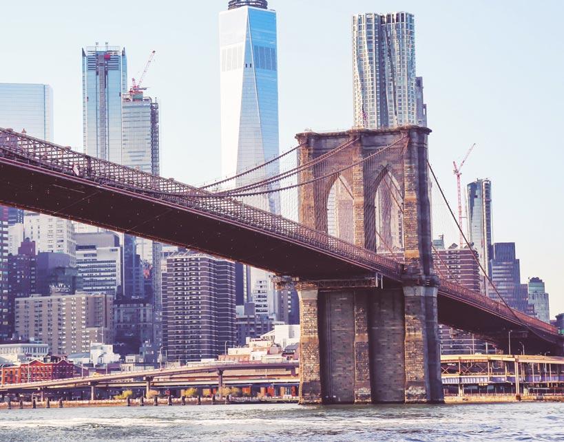 En 1883 Nueva York inauguró el puente colgante más extenso del mundo hasta ese momento: el Puente de Brooklyn, con una longitud de 1825 metros. Reconocible de manera instantánea gracias a sus cables de acero, ostenta una estructura abierta que le ayuda a soportar el viento. Este camino que conecta Brooklyn y Manhattan tiene un pasado trágico: nada menos que veintisiete obreros murieron en su construcción que se prolongó por trece largos años. Hoy es un clásico que recorren cada día una enorme cantidad de peatones, ciclistas y automovilistas.