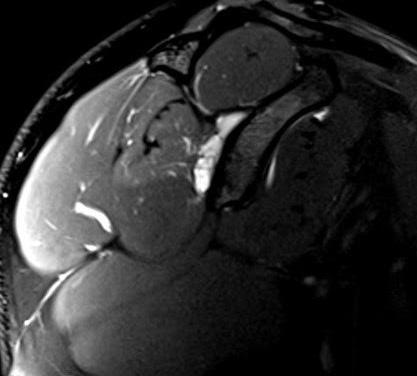 Figura 1: Secuencia sagital T1-FS: adecuada distensión de la cápsula articular tras la administración directa de medio de contraste bajo guía ecográfica.