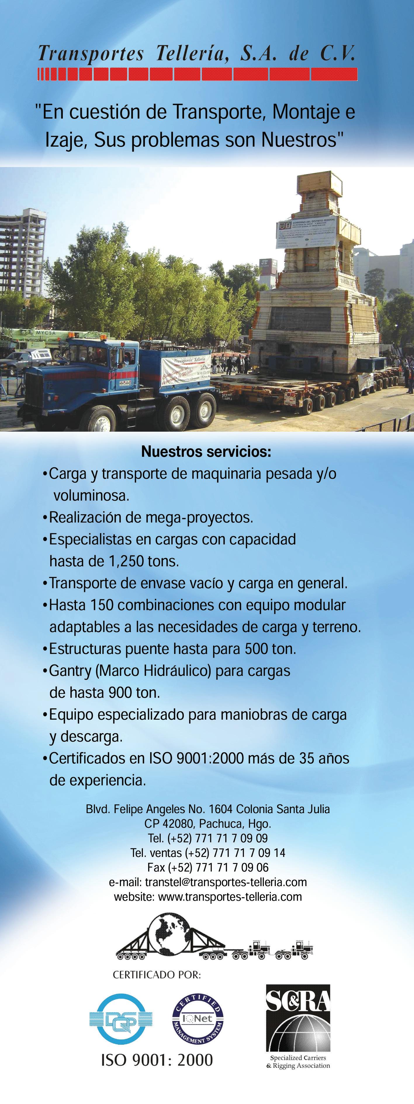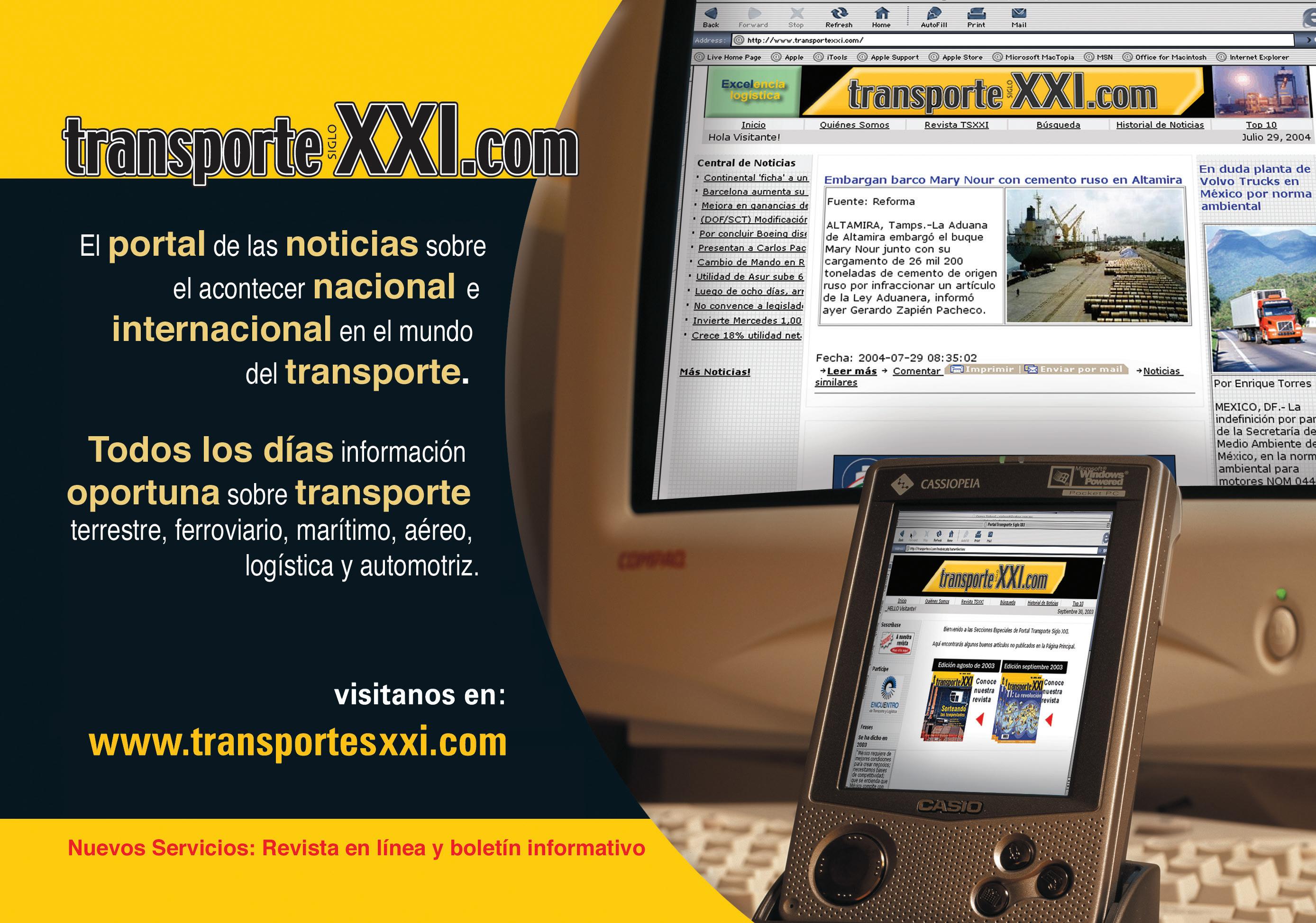 Transporte Siglo XXI es una publicación mensual editada por Grupo Comercial XXI, S.A. de C.V. Editor responsable: Osiel I. Cruz Pacheco. Registrada ante la Dirección General de Derechos de Autor de la Secretaría de Educación Pública, con el Certificado de Reserva de Derechos al uso exclusivo del titulo No.: 04-2000-020109433300-102. Certificado de Licitud de Titulo 11466 EXP. 1/432 "00"/ 14971 y Certificado de Licitud de Contenido 8053 EXP. 1/432 "00"/14971 Registro ISSN 1665-0239. Distribuida en México por Grupo Comercial XXI , S.A. de C.V. y por SEPOMEX. Tiraje 7000 ejemplares. TODOS LOS DERECHOS RESERVADOS. Prohibida la reproducción parcial o total sin el permiso expreso de los editores. Los artículos firmados son responsabilidad absoluta de los autores y no reflejan la posición de los editores. Pre-prensa e Impresión: Peche Impresiones, Quetzalcóatl 48, Col. Tlaxpana C.P. 11320 Delegación Miguel Hidalgo, México D.F. Tels.: 5705 7350, 5705 0204 y 5705 4946