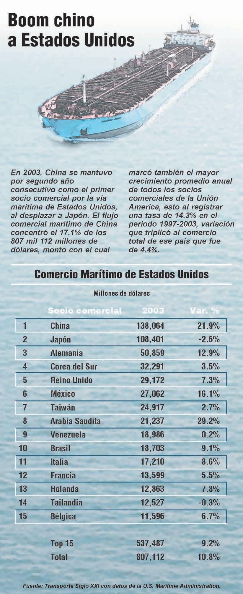 Según datos del Banco de Comercio Exterior de México (Bancomext) el intercambio comercial del país con Estados Unidos al 2003 alcanzó los 229 mil 627 millones de dólares; mientras con los países de Asia fue de 30 mil 773 millones de dólares y con Europa 24 mil 226 millones de dólares.
