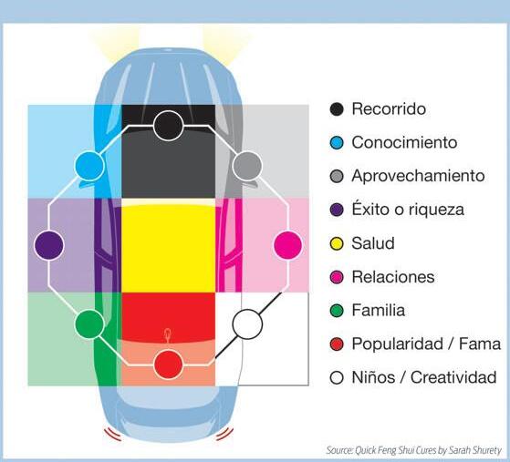elegir colores de los elementos fuego y madera como rojos y verdes para crear un ambiente más animado. Utilizar símbolos es importante también. Por ejemplo, agrega un ícono pequeño, como una estatua, una medalla o una foto, como recordatorio de conducir con precaución, ser cortés reduce el estrés. No tiene que ser algo visual, sólo algo que el conductor sepa que está ahí. Puede ser incluso algo dentro de la cajuela.