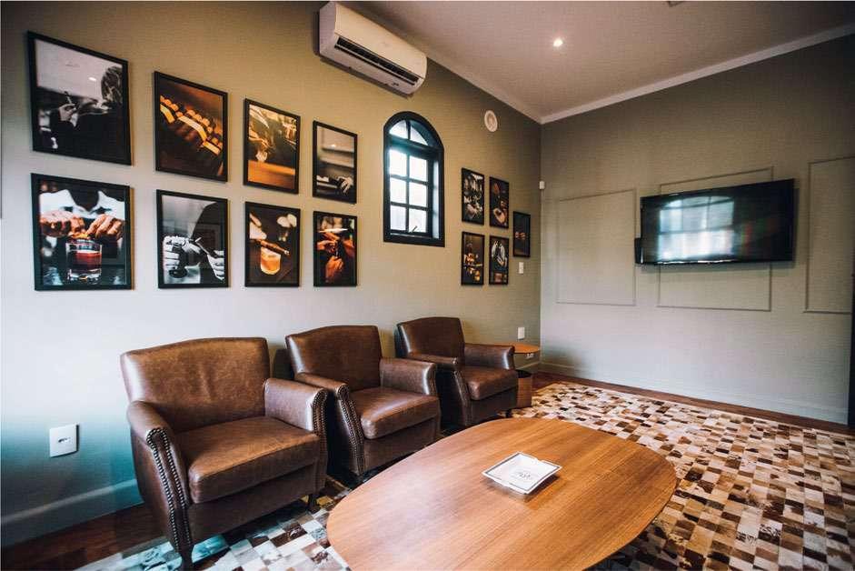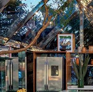 A casa oferece um espaço intimista e sofisticado, com elemen tos naturais como madeira, plantas, parede de tijolos aparentes contrastando com design impactante de lustres e mobiliário con temporâneo. Quem assina o projeto é o escritório SchwaLuciarab.
