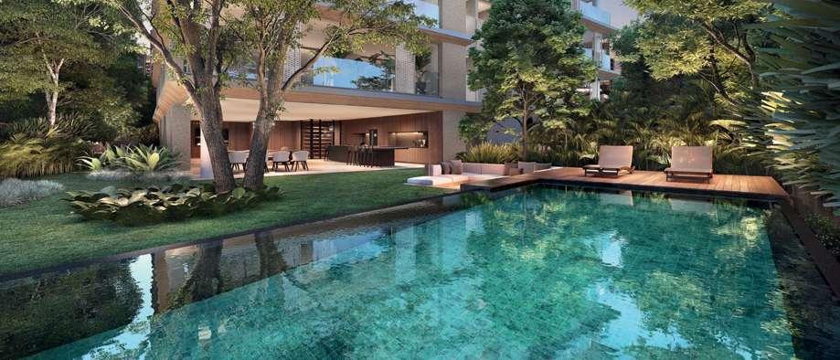 O paisagismo foi conceituado pela EDSA, escritório ame ricano, que se dedica ao uso adequado dos recursos da Ter ra e à criação cuidadosa de ambientes humanos, e da Car dim Arquitetura Paisagística, que foi responsável pela tropicalização das espécies. Juntas, elas integram a vida cotidiana à tranquilidade de espécies nativas. Para os ar quitetos Ricardo Cardim e Alessandra Caiado Cardim, as