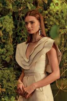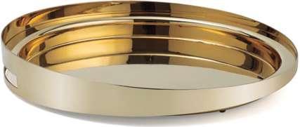 A bandeja dourada integra a coleção Poli, que homenageia uma jarra assinada pela arquiteta Camila Fix há 25 anos. A base recuada proporciona a sensação de que as peças flutuam. saintjames.com.br
