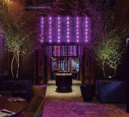 O projeto reúne clássico e moderno, com detalhes dos res taurantes japoneses cosmopolitas, junto com gravuras e pai sagismo dos mais tradicionais. Na entrada, há uma instalação de kanjis (letras japonesas) em LED. Um biombo de madeira com uma gravura clássica é o destaque do balcão do sushi bar. Na fundo do salão, os tetos se abrem, permitindo ao restau rante se transformar em um jardim ao ar livre.